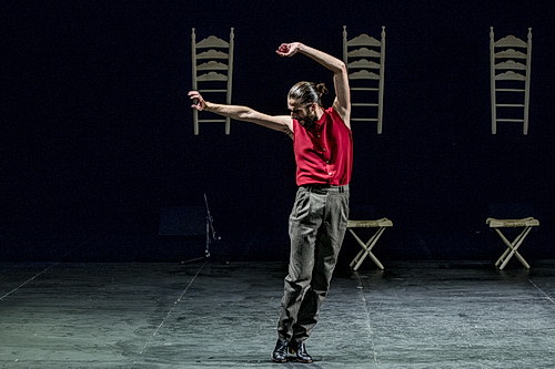 Die Seitenbühnen bieten Platz für zusätzliche Lautsprecher. Links vom Flamenco-Boden sind acht Stuhllehnen aufgestellt oder aufgehängt, vor sieben von ihnen stehen Hocker. Drei weitere Hocker sind vor dem Hintergrund aufgereiht, darüber hängen noch einmal vier Rückenlehnen. Anstatt des vierten Hockers ist ein Cajón platziert. Rechts vorne ist eine kleine Station mit Perkussionsinstrumenten aufgebaut. Olga Garcia gelingt es, in diesem Aufbau ausschließlich mit Weißlicht wunderbare, unaufdringliche Effekte auf den Punkt zu setzen. Die vierköpfige Banda betritt die Bühne und stellt sich mit dem Rücken zum Publikum auf. Schreitet zum Hintergrund, um dort, ebenfalls mit dem Rücken zur Tribüne, Platz zu nehmen. Der Tänzer zeigt sich abgewandt vom Publikum. Nach einer ersten Kostprobe seines Könnens erschallt die Stimme Susanne Zellingers aus dem Off. Das geschieht zwei oder drei Mal. Es hätte eine gute Idee sein können, aber sie hat keinen Bestand und wird dann aufgegeben. Dadurch wirkt sie unprofessionell. Eindrucksvoll, dass die Musiker trotz der deutschen Sprache ihre Einsätze auf das Wort genau finden.