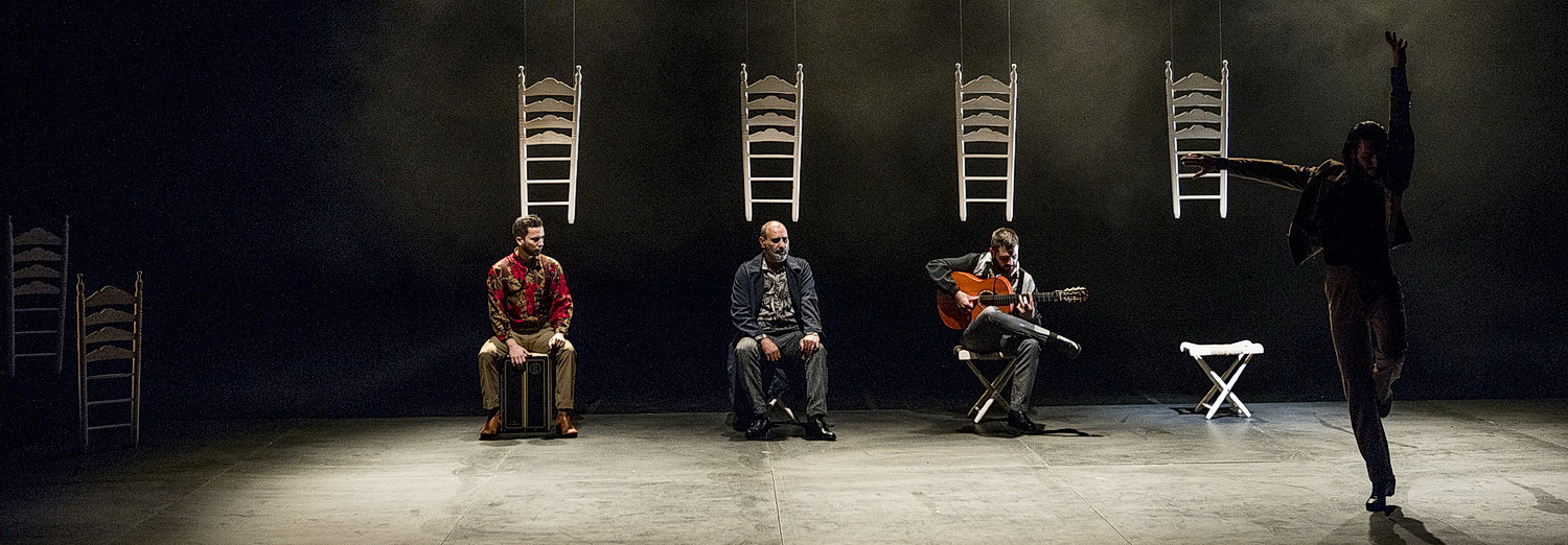 Die Seitenbühnen bieten Platz für zusätzliche Lautsprecher. Links vom Flamenco-Boden sind acht Stuhllehnen aufgestellt oder aufgehängt, vor sieben von ihnen stehen Hocker. Drei weitere Hocker sind vor dem Hintergrund aufgereiht, darüber hängen noch einmal vier Rückenlehnen. Anstatt des vierten Hockers ist ein Cajón platziert. Rechts vorne ist eine kleine Station mit Perkussionsinstrumenten aufgebaut. Olga Garcia gelingt es, in diesem Aufbau ausschließlich mit Weißlicht wunderbare, unaufdringliche Effekte auf den Punkt zu setzen. Die vierköpfige Banda betritt die Bühne und stellt sich mit dem Rücken zum Publikum auf. Schreitet zum Hintergrund, um dort, ebenfalls mit dem Rücken zur Tribüne, Platz zu nehmen. Der Tänzer zeigt sich abgewandt vom Publikum. Nach einer ersten Kostprobe seines Könnens erschallt die Stimme Susanne Zellingers aus dem Off. Das geschieht zwei oder drei Mal. Es hätte eine gute Idee sein können, aber sie hat keinen Bestand und wird dann aufgegeben. Dadurch wirkt sie unprofessionell. Eindrucksvoll, dass die Musiker trotz der deutschen Sprache ihre Einsätze auf das Wort genau finden.