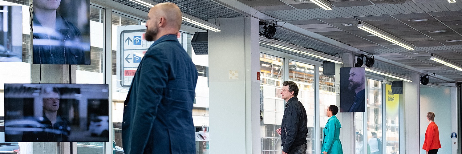Christof Seeger-Zurmühlen hat dazu ein Konzept für ein Theater­stück entwi­ckelt, bei dem er auch Regie führt, Juliane Hendes die Texte geschrieben. Den Rahmen in Form von Bühne und Kostüm schafft Simone Gries­haber. Vom Eingang aus gesehen, ist am Fußende des ebenerdigen Saals vor der Technik eine Tribüne aufgebaut, die den Zuschauern in Sachen Sitzkomfort einiges zumutet und knappe anderthalb Stunden sehr lang werden lässt. Der Bühnenraum erstreckt sich über die gesamte Ebene und beein­druckt durch die Tiefe, die im Licht­design von Philippe Waldecker noch einmal deutlich gewinnt. Zahlreiche Monitore, auf denen die Videos von Julia Franken und Barbara Schröer laufen oder die Schau­spieler in Spiel­si­tua­tionen live gezeigt werden, sind im Raum angeordnet. Bei den Bildern wird vollständig auf sensa­ti­ons­lüs­terne Fotos von den Gescheh­nissen verzichtet. Zusätzlich werden viele Stühle gerückt. Der hohe Aufwand an Technik, die auch noch reibungslos funktio­niert, ist eindrucksvoll. Die Klang­ku­lisse, die Bojan Vuletić erstellt hat, kommt ein wenig zu kurz. Da hätte man sich mehr gewünscht. Insgesamt ein wunder­bares Umfeld, das sugge­riert, das hier mit ausrei­chend Abstand eine mindestens näherungs­weise objek­ti­vierte Sicht­weise gezeigt werden wird.