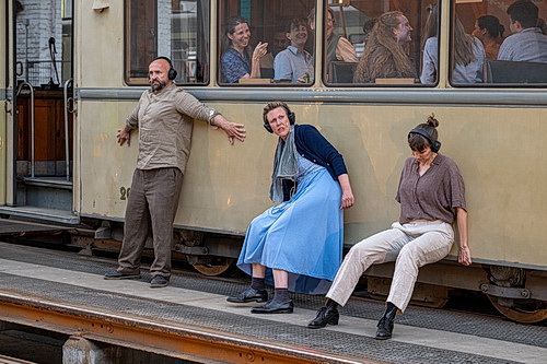 Zumal wir Valentina K., 1942 im Alter von 17 Jahren aus Kiew nach Nazi-Deutschland verschleppt, auch zuerst hören. Im historischen Sonderzug der Rheinbahn rumpeln wir vom Worringer Platz via Hauptbahnhof Richtung Steinberg und bekommen über Kopfhörer, eine schon fixe Größe jeder Pièrre.Vers-Dramaturgie, ein Zuspiel aufs Ohr. Valentina K. meldet sich, stellt sich und ihre Geschichte vor. Leise. Eindringlich. Immer dann, wenn im weiteren Stückverlauf dieser gefasste Flüster- und Hörspielton durchdringt, wenn er sich mischt, wenn er unterbrochen wird von den sparsam-echohaften Klängen von Bojan Vuletić, entfaltet die theatrale Stückvermittlung ihre intensivste Wirkung. Wer bei sich ist, kann es auch für andere sein.