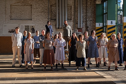 Das stärkste Bild seiner Inszenierung findet Christof Seeger-Zurmühlen für den Schluss. Ein Moment, in dem sichtbar wird, was das Theaterkollektiv Pièrre.Vers getrieben, was es angetrieben hat zu Endstation fern von hier, dem vierten und letzten Teil seiner umfänglichen, theatralen Vergegenwärtigung der NS-Zeit in Düsseldorf. Alles schießt zusammen in ein Bild ohne Worte. In einen Moment von Zuschauer-Erkenntnis, Zuschauer-Selbsterkenntnis: Wir sind die schweigende Mehrheit. Diejenigen, die zugeschaut haben, die profitiert haben. Damals. Im Krieg. Als Düsseldorf, die Gauhauptstadt, „Anwerbebezirk“ ist für Zwangsarbeiter aus der Ukraine – ausgerechnet aus der Ukraine.