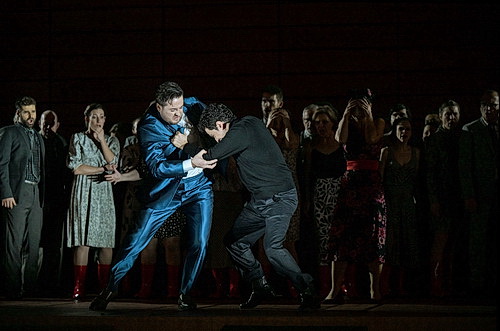 Onegin wie Lenski empfinden ja das Sinnlose ihres Zweikampfs. „Feinde!“, stoßen sie in ihrem tieftraurigen Duett hervor. Um dann sich zu besinnen: „Ach, sollten wir nicht lieber lachen, ehe wir unsere Hände mit Blut beflecken, und uns als Freunde trennen?“ In Thalheimers Sicht ist Onegin derjenige von beiden, der dem Wahnsinn des Duells Einhalt bieten möchte. Lenski stürmt nach Trennung der Rivalen durch Saretzkij, dargestellt von Valentin Ruckebier, auf den vorgeschriebenen Platz, während Onegin seine Position geradezu bedächtig einnimmt und, wie es für Sekundenbruchteile scheint, sich dem Freund als Zielperson anbietet, ehe er selbst schießt.