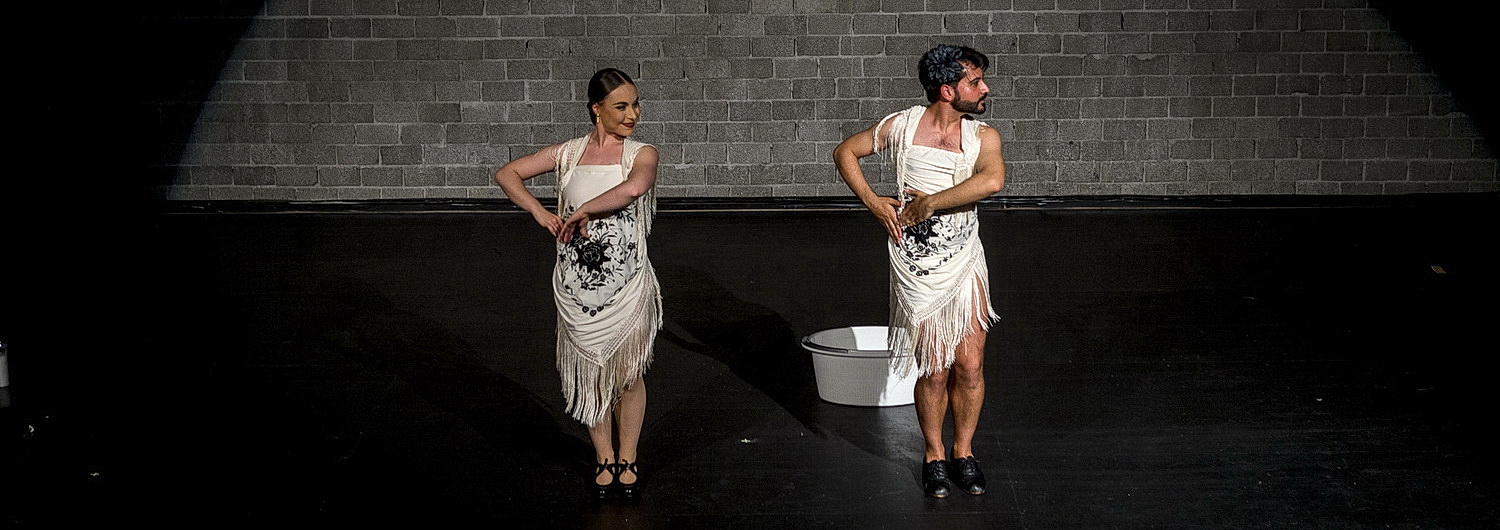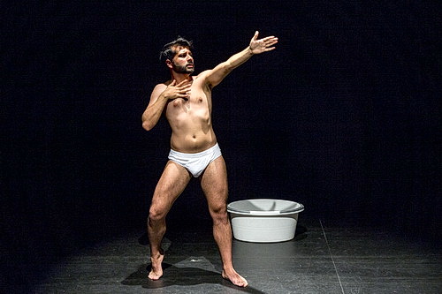 Und damit sind die Konven­tionen aufge­hoben. Da darf es einen Ausdruckstanz à la Isadora Duncan genauso geben wie – endlich im Torero-Anzug – den Machismo. Um die Rollen­ver­teilung aufzu­heben, holt sich López die Tänzerin Irene Hernández zu Hilfe. Die kleidet ihn in eine Art Tunika, in der er zur entspre­chenden Musik eine Tänzerin der 1950-er Jahre playback singt und ganz wunderbar ihr Augen­klimpern und die laszive Bewegungsform imitiert. Köstlich! Auch Hernández spielt mit den Geschlech­ter­rollen, löst sie im Flamenco auf, an den sich López anschließt. Zwischen­zeitlich verliest der Choreograf zehn Thesen der Flamenco-Aktivistin Matilde Coral, die zwar aus dem Jahr 2011 stammen sollen, aber so alter­tümlich wirken, als seien sie hundert Jahre eher entwi­ckelt worden. Was mögli­cher­weise daran liegt, dass die legendäre Tänzerin die Essenz ihres Tanzes mit 76 Jahren veröf­fent­licht hat. Da bleibt so manche Entwicklung auf der Strecke. Legiti­miert wird der Vortrag durch die theatrale Überziehung. Wirklich großartig, dass López die Texte auf Deutsch vorträgt. Zum ersten Mal in diesem Festival bekommt man das Gefühl, dass sich irgend­jemand dafür inter­es­siert, wo das Festival statt­findet. Schluss­endlich landet die Aufführung wieder beim Ave, Maria und López in der Fußwanne. Was auch immer uns das sagen will. Ästhe­tisch jeden­falls gibt es hier keine Einwände.