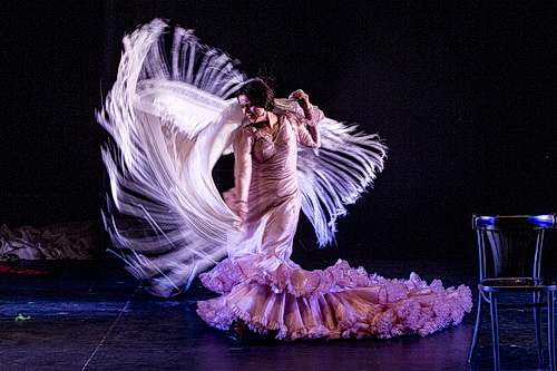 María Moreno ist in Cádiz geboren. Seit 2004 tanzte sie in der Compagnie von Eva Yerbabuena. Nach zehn Jahren wollte sie ihre eigene Tanzsprache finden, nachdem sie sich 2006 erstmals bei renommierten Festivals wie der Biennal de Flamenco in Sevilla und in Jerez de la Frontera als Solokünstlerin vorgestellt hatte. Das Stück De la concepción entwickelte sie gemeinsam mit Yerbabuena und dem musikalischen Leiter Andrés Marin, um es erfolgreich bei der Biennale in Sevilla zu zeigen. Der Inhalt des Stückes scheint unwichtig, und das ist für das deutsche Publikum wohl eher ein Glücksfall, muss es sich beim Gesang, von dem es hier reichlich gibt, doch eher auf den Klang als auf das Verständnis verlassen. Erläuterungen zu den Inhalten gibt es, wieder einmal, nicht. Man sieht am Tanzhaus NRW also, wenn man so will, gerade mal die Hälfte des Stückes. Der Festivalleitung kann das wohl vergleichsweise egal sein. Das Festival ist durchfinanziert, der Saal mit Spaniern und Stammpublikum gefüllt. Eine auskömmliche, wenn auch trügerische Situation. Das eigentliche Ziel, den Flamenco, der seit 2010 immaterielles Kulturerbe Andalusiens ist, als solches im Bewusstsein der Welt zu verankern, scheint dabei aus dem Auge zu geraten und in der Blase zu versickern. Dem wirkt Moreno mit ihrem furiosen Auftritt entgegen.