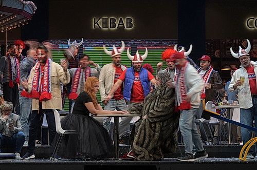 Sein Konzept der Transformation hält der Regisseur mit großer Stringenz durch. Der zweite und dritte Aufzug spielen in der Mitte der Stadt, auf einem zentralen Platz, der direkt neben dem Kino liegen könnte. Stores, darunter ein Kebab-Verkaufsstand, begrenzen den Hintergrund. Ein Karussell ist aufgebaut. Eine Wippe bietet Kindern Spaß. Ein Automat, zu dem es auch Senta zieht, spuckt ein Stofftier aus, wenn es mit dem Greifarm getroffen ist. Seitlich tauscht sich eine Schwangerengruppe aus. In dieser pittoresken Ausstattung von Zinovy Margolin mit den Kostümen von Olga Shaishmelashvili rennt Senta gegen all das an, was der Erfüllung ihres Traums entgegensteht. Hier agieren in einer Sequenz die Anhänger des Fußballclubs der Stadt in Fanmonturen, wozu auf einem Screen im hinteren Teil der Bühne Bilder aus der TV-Übertragung der aktuellen Partie ihres Vereins laufen. Multimedia genug? Keineswegs. Statisten tragen einen LED-Fernseher herein, auf dem die Holländer-Geschichte als Telenovela gezeigt wird, mit der mythischen Gestalt als schmachtendem Kinohelden.