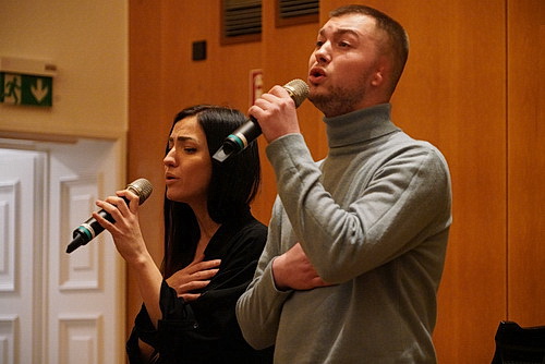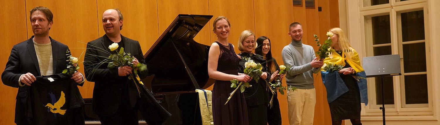 Nach anderthalb Stunden hätte das Konzert eigentlich enden können. Stattdessen gibt es dann eine Pause. Anschließend tritt der Sänger Mikhail Zsar mit der Pianistin Irina Slania als Duo Dua Mi auf. Topoli von Petro Soloduha und Dwa Kolory von Alexandr Bilasch scheint keiner der Anwesenden zu kennen, was die Stimmung nicht im Geringsten schmälert. Warum die Pianistin Ievgeniia Iermachkova mit ihrem Vortrag von Walzer, la Chorale und l’Aria aus der Suite Nr. 5 von Myroslav Skorik keinen Anklang beim Publikum findet, ist vollkommen unverständlich und liegt sicher nicht an ihrem Spiel. Noch einmal begeistert Petrychenko das Publikum, diesmal mit Mriya von Yakiv Stepovyi und dem Lied op. 17 Nr. 1 einschließlich Improvisation von Levko Revutskyi. Da werden die Klänge gar ein bisschen jazzig, was angesichts der fortgeschrittenen Uhrzeit durchaus der richtige Einschlag ist. Das Duo Mi und Vetrova sorgen mit Imagine von John Lennon für das richtige Finale, auch wenn die musikalische Ausgestaltung sicher nicht ausgereift ist. Aber bei dieser Hymne spielt das wohl kaum eine Rolle, so auch an diesem Abend nicht, der mit stehenden Ovationen ein rauschendes Ende findet.