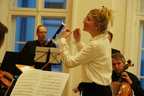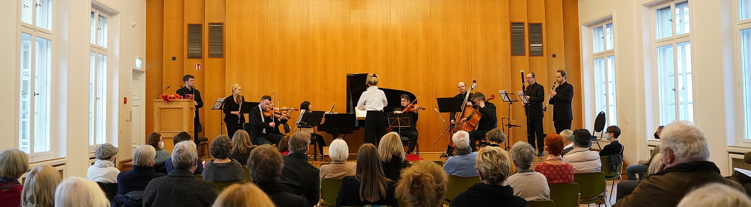 Vor zwei Jahren rief Möller das Düssel­dorfer Toy-Piano-Festival ins Leben, um zu zeigen, auf welch hohem Niveau man mit diesen kleinen Biestern Spaß haben kann. Es ist mit zwei Spiel­tagen – noch – kein großes Festival, hat aber bereits in der zweiten Ausgabe eine Fan-Gemeinde gefunden, die sich auch an diesem Sonntag­nach­mittag im Düssel­dorfer Palais Wittgen­stein, einem der Kammer­mu­siksäle der Stadt, einfindet. Die möglichen Sitzplätze sind fast vollständig belegt. Die Künst­le­rische Leiterin hat zu einem Nachmittag unter dem Titel Happy Birthday E.T.A. Hoffmann einge­laden. Der Zeitpunkt zur Vorstellung des Programms ist geschickt gewählt. Denn der 200. Todestag wird erst im kommenden Jahr begangen. Am 25. Juni 1822 verstarb der damals 45-jährige Jurist, Komponist, Kapell­meister, Musik­kri­tiker, Zeichner und Karika­turist an einer Atemlähmung in Berlin. Dementspre­chend wird es im nächsten Jahr Bedarf an einer quali­tativ hochwer­tigen Aufführung geben. Und nach diesem Nachmittag steht wohl so gut wie fest, dass Frederike Möller mit ihrem Team auf Reisen gehen wird. Denn die Musikerin hat keinen Aufwand gescheut, ein extrem dichtes und kurzwei­liges Programm auf die Beine zu stellen. So gut es geplant war, wird es gleich zu Beginn erst mal geändert. Und das liegt an der Spiel­freude des zehnköp­figen Kammer­or­chesters, das Möller für diesen Anlass zusam­men­ge­stellt hat. Weil im Moment nämlich niemand weiß, wann man wieder zusam­men­kommen wird, um gemeinsam zu musizieren, haben die Musiker beschlossen, Wolfgang Amadeus Mozarts Fantasie in f‑moll komplett zu spielen, anstatt nur mit dem ersten Satz einzu­steigen. Der ursprüng­liche Plan hätte sicher die Sprit­zigkeit des Programms besser bedient, aber die Ankün­digung Möllers sorgt für Wohlwollen im Publikum. Die Fantasie hat Mozart für einen Orgel­au­to­maten namens Flötenuhr in einem Wachs­fi­gu­ren­ka­binett kompo­niert. Er brauchte halt das Geld … Möller steht am Pult und führt souverän und wachsam durch das Werk. Yukiko Fujieda am Flügel begeistert schon mal mit einer kleinen Einlage an einem Toy Piano. Wenn man es kann, ist das Kinder­klavier eine Berei­cherung für diese Fantasie.