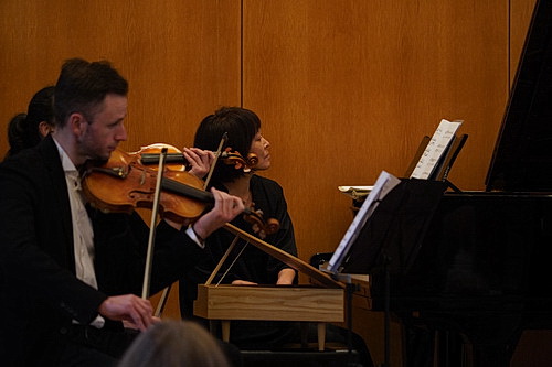Die beiden Sätze aus dem Konzert für Klavier in Es-Dur von Ludwig van Beethoven, der dritte Komponist der von Hoffmann meist­be­wun­derten, werden im Arran­gement für Flügel und Streich­quintett vorge­tragen. Das kann man ohne Weiteres machen, wenn man schon den nächsten Joker im Ärmel hat. Zuvor sorgt Bratschist Georg Sarkissjan noch für ein Schmunzeln, als er Möller am Flügel ein weiteres Toy Piano bereit­stellt. Den Blumen­walzer aus Peter Iljitsch Tschai­kowskys Nussknacker spielen Fujieda und Möller elegant an zwei Toy-Piano-Flügeln. Selbst­ver­ständlich darf auch Musik aus Hoffmanns Erzäh­lungen von Jacques Offenbach nicht fehlen, um das Gesamtbild abzurunden. Ja, und jetzt wird dem Publikum gedient. Denn was anderes als die Barcarole käme in Frage? Auch wenn das Arran­gement ein wenig unrund klingt: Die schwel­ge­ri­schen Phrasen erklingen – und was will man mehr?