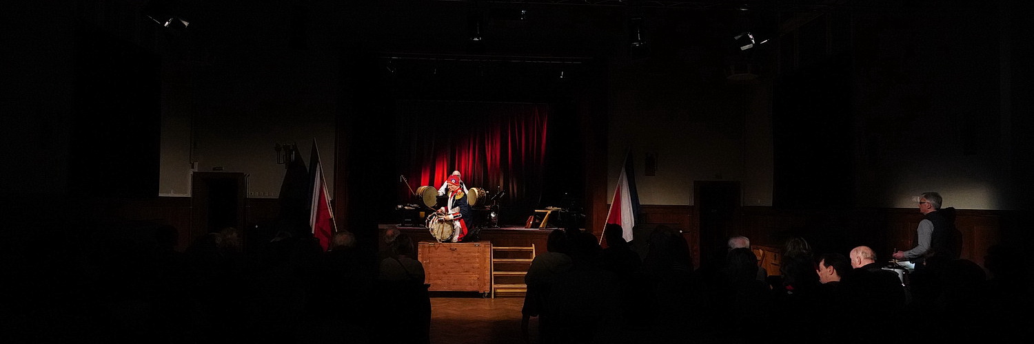 Jetzt hat sich das Theater der Klänge der Aufgabe gestellt. Jörg U. Lensing, Inhaber des Theaters, hat sich dazu eine hübsche Geschichte ausge­dacht. Heinrich Heine trifft Armand Le Grand, seines Zeichens Tambour, also Trommler, in der Armee der Grande Nation, der nicht nur die Franzö­sische Revolution, sondern auch Napoleon Bonaparte erlebt. Zwar sprechen die beiden nicht die gleiche Sprache, aber die Sprache der Musik überwindet alle Grenzen. Und so erfährt Heine von den Gescheh­nissen in Frank­reich. Darüber berichtet er seinem Publikum ebenso wie über die Auswir­kungen für Düsseldorf. Lensing hat dazu eigene mit Heine­schen Texten verwoben, und zwar so geschickt, dass man beim Besuch einer Aufführung nicht unter­scheiden kann, welche Texte von wem stammen. Ist im Grunde auch uninter­essant, wesentlich ist, dass eine schlüssige Geschichte entsteht, die von zwei Schau­spielern erzählt und von zwei Musikern untermalt werden kann. Die beiden Darsteller steckt Caterina Di Fiore in wunderbare Kostüme, die für verschiedene Situa­tionen immer wieder leicht abgewandelt werden können. Es ist die zweite Produktion, die das Theater der Klänge im Dä Düssel­dorfer Salon zeigt, einem histo­ri­schen Veran­stal­tungssaal, den viele Düssel­dorfer noch als Templum kennen. Trotzdem muss das Bühnenbild so angelegt sein, dass es nicht nur in das großartige Ambiente des Saals passt. Schließlich will das Theater günsti­gen­falls noch touren. Dementspre­chend kommt die Bühne mit wenigen Elementen aus. Drei Holzkisten und eine Etagere, die als Bastille, Sprecher­podium, Muniti­ons­kiste, Schrein und so weiter dienen können. Das Ganze durch­dacht und schlüssig, sprich, für den Zuschauer auch ohne große Erklä­rungen nachvoll­ziehbar. Die Gegen­stände werden ebenerdig zum Einsatz gebracht, während auf der eigent­lichen Bühne die zahlreichen Instru­mente aufgebaut sind, die an dem Abend zum Einsatz kommen. Zusätz­liche Instru­mente sind an der rechten Seite des Zuschau­er­be­reichs aufge­stellt. Ein paar Requi­siten vervoll­stän­digen die Ausstattung. Video­pro­jek­tionen, die zum einen Schau­plätze benennen, zum anderen verschwommene Bilder von Truppen­be­we­gungen und Aufmär­schen zeigen, wurden vom Koope­ra­ti­ons­labor im Dortmunder U perfekt erstellt und runden das Gesamtbild ab. Das wird von Markus Schramme gekonnt ausgeleuchtet.