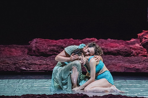 Die Bühne ist ein Traum. In der Mitte, etwas seitlich versetzt, ist eine Wasserfläche angelegt, die von „Felsengestein“ aus angemalten Weichgummi umgeben ist. Hinter der Wasserfläche wird daraus eine Art Podest. Links davon sind im Hintergrund fünf Schaukeln als Luftelemente aufgehängt. Die dienen allerdings eher als Versammlungsort, als dass sie rechten Einsatz finden. Über der Bühne ist eine Brücke angebracht, die einen Lichtschacht über der Wasserfläche freigibt. So kann Begoña Garcia Navas immer wieder mit interessanten Lichteffekten glänzen. Bei den Kostümen hat Lauren Steel viel Fantasie walten lassen. Der von Thiersch zusammengestellte Chor älterer Bürger aus Düsseldorf und Umgebung ist in lilafarbene, wallende Gewänder gekleidet, die Darsteller tragen türkisfarbene, seidene Stoffe und reichlich Perlenschmuck. Das hat schon was von Geschichten aus 1001 Nacht. Die Choreografie ist eine Teamarbeit von Thiersch und den Tänzern. Sie ist abwechslungsreich, vielschichtig und in Zusammenhang mit den Chorbewegungen entstehen hier geradezu opernhafte Bilder. Bis hierhin ist es eine wunderbare Tanzdarbietung, die zahlreiche Emotionen über Humor, Wut, Nachdenklichkeit, Zagen und Traurigkeit zeigt, eben alles, was in das Umfeld von Trauer gehört.