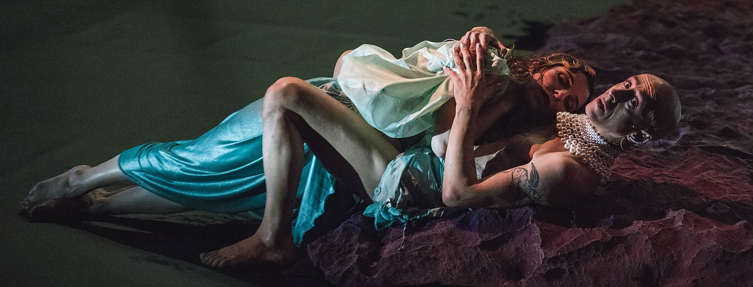 Die Bühne ist ein Traum. In der Mitte, etwas seitlich versetzt, ist eine Wasserfläche angelegt, die von „Felsengestein“ aus angemalten Weichgummi umgeben ist. Hinter der Wasserfläche wird daraus eine Art Podest. Links davon sind im Hintergrund fünf Schaukeln als Luftelemente aufgehängt. Die dienen allerdings eher als Versammlungsort, als dass sie rechten Einsatz finden. Über der Bühne ist eine Brücke angebracht, die einen Lichtschacht über der Wasserfläche freigibt. So kann Begoña Garcia Navas immer wieder mit interessanten Lichteffekten glänzen. Bei den Kostümen hat Lauren Steel viel Fantasie walten lassen. Der von Thiersch zusammengestellte Chor älterer Bürger aus Düsseldorf und Umgebung ist in lilafarbene, wallende Gewänder gekleidet, die Darsteller tragen türkisfarbene, seidene Stoffe und reichlich Perlenschmuck. Das hat schon was von Geschichten aus 1001 Nacht. Die Choreografie ist eine Teamarbeit von Thiersch und den Tänzern. Sie ist abwechslungsreich, vielschichtig und in Zusammenhang mit den Chorbewegungen entstehen hier geradezu opernhafte Bilder. Bis hierhin ist es eine wunderbare Tanzdarbietung, die zahlreiche Emotionen über Humor, Wut, Nachdenklichkeit, Zagen und Traurigkeit zeigt, eben alles, was in das Umfeld von Trauer gehört.