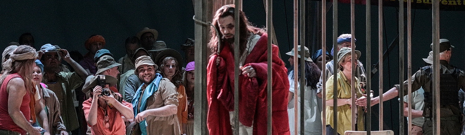 Die Sänger­dar­steller überzeugen in den kalei­do­skop­artig struk­tu­rierten, schil­lernden Charak­teren wie in den stilis­ti­schen Überspit­zungen. In erster Linie der franzö­sische Tenor Sébastien Guèze, der die Partie des Jean mit schönem Timbre und im hohen Register mit eleganter frankophil gefärbter Ausdrucks­kraft gestaltet. Als Hérode imponiert der Bariton Bogdan Baciu mit Vehemenz in der Stimme und energi­schem Aplomb im Spiel. Die Illusion seines Alter Ego gelingt dem Schau­spieler Andreas Bittl hervor­ragend. Jorge Espino macht mit seinem leicht flackernden Bariton aus dem Konsul Vitellius eine amüsante Karikatur.