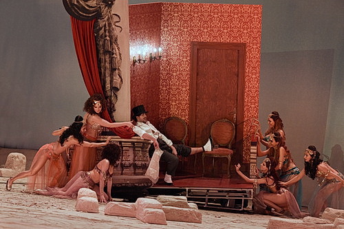 In der Sicht des Regis­seurs ist die Belle Époque, in der die Grand opéra ihre Vollendung erlebt, jene Phase, in der die kolonia­lis­tische Sicht Europas auf die übrige Welt unüber­sehbar wird wie der Pariser Eiffelturm. Das hindert Fioroni überhaupt nicht, in einem Prélude eben jene Epoche in ihrer Haupt­stadt Paris nostal­gisch-schön Revue passieren zu lassen. In Christian Weissen­bergers gekonntem Video flaniert zu den Klängen der Ouvertüre das Alter Ego des Hérode, ein elegant geklei­deter Schau­spieler, durch die schönsten Viertel der Stadt, die Treppen hinauf zur Kirche Sacré-Cœur, danach in den Louvre und später in das Bahnhofs­bistro Le train bleu, Mekka der reichen Bourgeoisie.