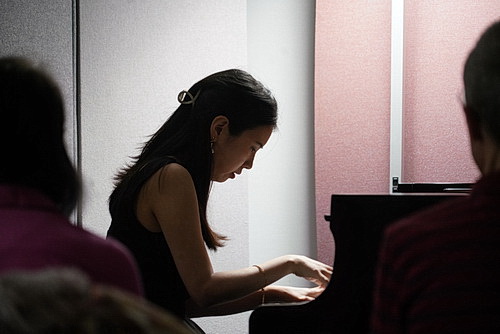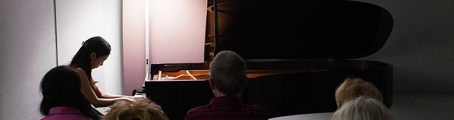 Allein daran dürfte es heute nicht liegen, dass es gerade mal elf Menschen in die Geschäftsräume geschafft haben. Bei Temperaturen von 25 °C am Samstag Anfang April gibt es sicher verlockendere Angebote der Freizeitgestaltung als ein Klavierkonzert im geschlossenen Raum. Dabei ist hier im Eingangsbereich alles liebevoll für die Besucher hergerichtet. Eine großzügige Bestuhlung, bei der sich keiner beengt fühlen muss, die Programme liegen bereits auf den Sitzplätzen, in einer Ecke wird Wein und Wasser angeboten. Gewiss, es gibt hier kein Podium, so dass die Künstlerin von den hinteren Reihen aus kaum zu sehen ist, aber dafür ist der Flügel in einer akustisch aufbereiteten Ecke aufgebaut, so dass sich hier ein warmer, voller Klang ergibt. Abgesehen von einem leichten Klirren des Instruments sind das fast so ideale Bedingungen wie im Bechstein-Zentrum der Stadt.