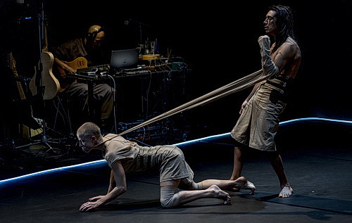 Kira Metzler, Claudio Rojas und Giulia Russo betreten die Bühne. Metzler und Rojas stellen sich vor dem Pult des Musikers auf, Russo nimmt auf dem Hocker Platz. Nach einigen Sprachübungen zum ausgesprochenen Vergnügen des Publikums und einem von Russo auf Englisch vorgetragenen Text beginnt der eigentliche Tanz. Woirgardt hat seine Musik diesmal sehr viel direkter auf die Tänzer zugeschnitten. Er entfaltet einen Klang, der mitunter Tales of Mystery and Imagination von The Alan Parsons Project assoziiert, aber auch schon mal an die Filmmusik von Science-Fiction-Filmen erinnert. Über Klangteppichen ertönen die gestrichenen Saiten von E- oder akustischen Gitarren. Wie immer greift der Komponist aber auch gern mal zu ungewöhnlichen Klangerzeugungsinstrumenten wie einer Drahtbürste. Irritierend, wenn er immer mal wieder einen Klangfluss abrupt abbricht, um einer neuen Idee zu folgen. Mit den Tänzern bleibt er dabei stets im rhythmischen Einklang.