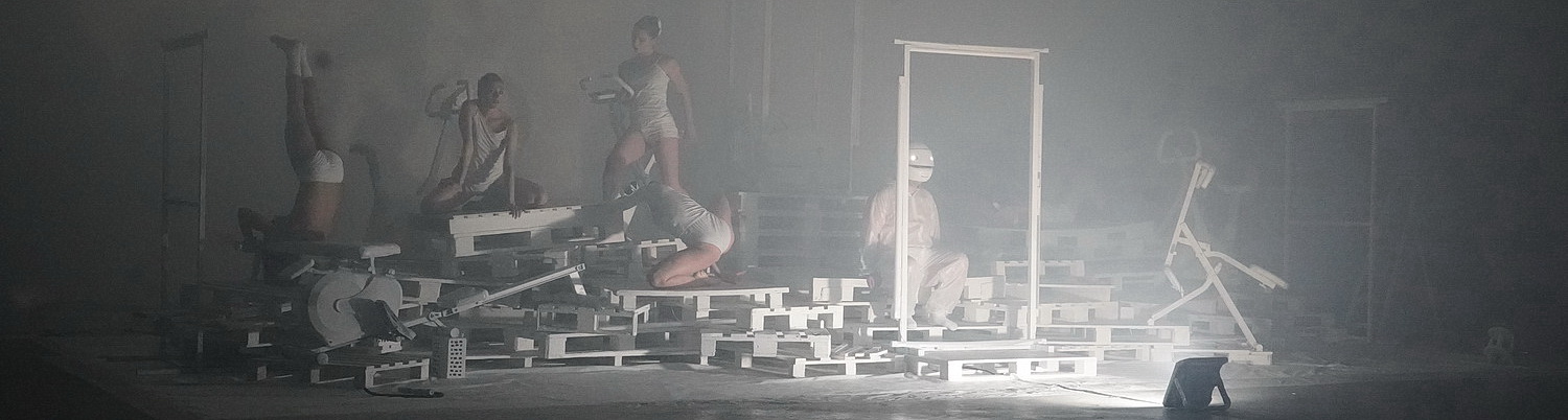 Beim Eintritt erklingt das Präludium in h‑Moll, BWV 544, von Johann Sebastian Bach. Die Szene ist gespenstisch. Dichter Nebel liegt über einer Landschaft aus weißen Europaletten, auf denen Selbstertüchtigungsgeräte verteilt sind. Davor ein „Türrahmen“ aus Neonröhren. Ohne viel Fantasie mag man hier die Überreste eines Fitness-Studios nach der Apokalypse erkennen. Verbliebene Besucher setzen unbeirrt ihr Training fort, teils bis zur Unkenntlichkeit mit obskuren Helmen vermummt. Unter ihnen auch Mejia, der auf seinem Helm einen Monitor trägt. Gegenüber der Szene, zwischen den Zuschauerreihen ist eine Sitzgruppe aufgebaut, auf der wechselweise Akteure Platz nehmen, unter ihnen Touzeau, der heute wohl mit einem ebenfalls geweißten Einkaufswagen den Personentransport übernimmt. Außerdem ist auf dem Gefährt die Musikquelle befestigt.