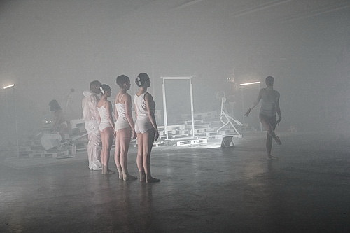 Die vier Tänzerinnen – Alice Hunter, Caroline Powell, Luise Stehmann und Valeria Di Mauro – sind in Herrenunterwäsche gekleidet. Ärmellose Unterhemden und Hosen, die an die berühmte Schiesser-Feinripp-Unterhose, allerdings ohne den mindestens genauso berühmten Eingriff, erinnern. Neu im Team ist Di Mauro. Sie ersetzt Anri Hirota, die sich in ein Festengagement nach Dresden verabschiedet hat. Es ist kein Überlebenskampf, den die Damen zelebrieren, sondern eher ein Weiter so, als sei nichts geschehen. Etwa in der Mitte der dreiviertelstündigen Aufführung tritt Bassbariton Thomas Huy im weißen Overall auf den Plan, der aus Franz Schuberts Winterreise neue Musik kreiert. Neben Vokalisen und improvisierten Melodien wird Gute Nacht und Lindenbaum erkennbar. Bild- und Klanggewalt lassen die Tänzerinnen „ins Glied“ zurücktreten, zumal sie über Strecken ohnehin kaum mehr als Silhouetten zu sehen sind. Begrüßenswert unbedingt, dass Huys Gesangsqualitäten stärker in den Vordergrund rücken.
