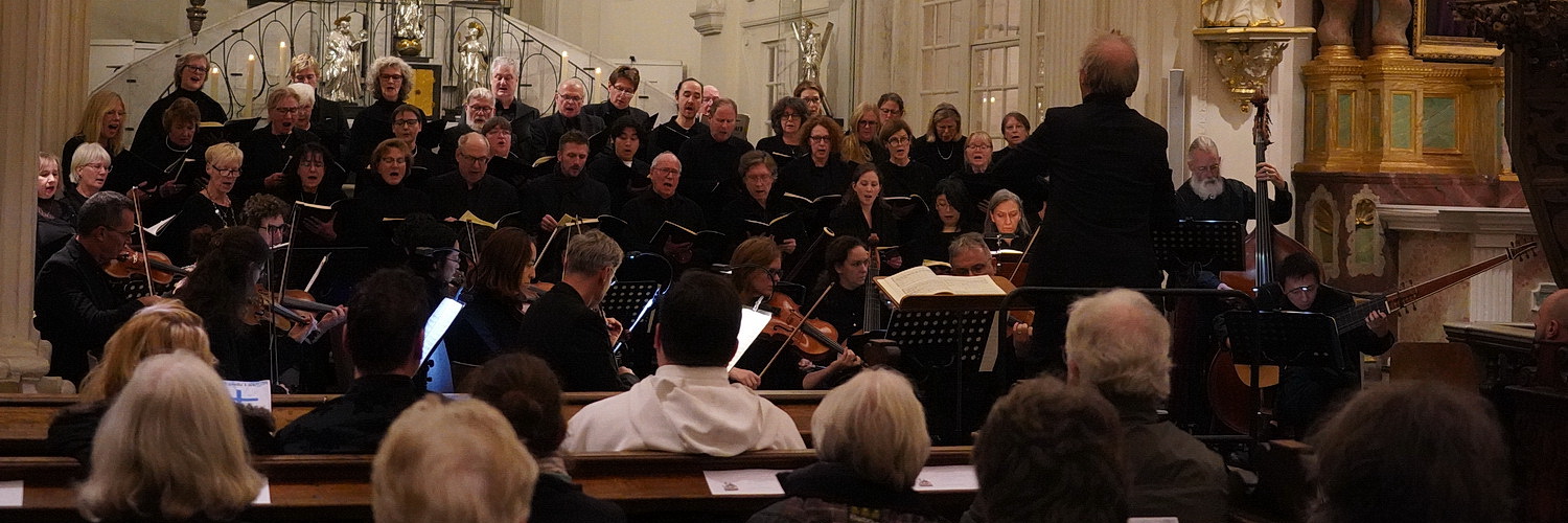 Aber können einen solche Dinge nach mehr als zwei Jahren Wartezeit noch beunru­higen? Offenbar nicht. Stephan Hahn, Chorleiter und Dirigent des heutigen Abends, führt Chor und Orchester ruhig, konzen­triert und unauf­geregt durch die Partitur. Während das Orchester mit einer formi­dablen und ausge­gli­chenen Begleitung aufwartet, glänzt der Chor mit einer ausge­sprochen diffe­ren­zierten Gesangs­leistung. Die Akustik der Kirche erlaubt zwar nur sehr bedingt Textver­ständ­lichkeit, aber den Choristen gelingen feine Abstu­fungen von großem Glanz über spannungs­ge­ladene Strecken bis zu jubelnden Schlussklängen.