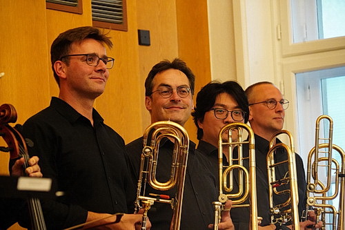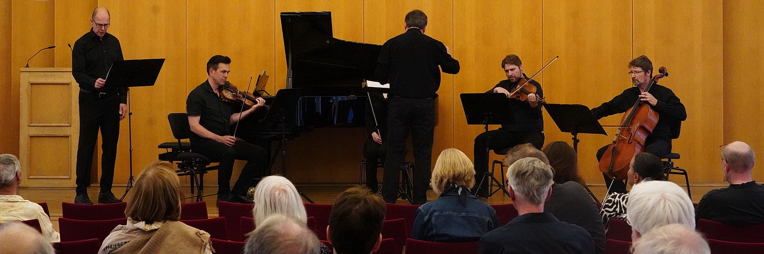Auch das folgende Stück, das Dobro­wolny 199697 kompo­nierte, dirigiert er. Tuba mirum ist ein Werk für Streich­quartett, Klavier und vier Posaunen im Raum. „Die wundersame Posaune erschallet über die Gräber der Welt und ruft alle vor den Thron Gottes“ heißt es zu dem Stück, das seine Düsternis in den Instru­menten beschwört. Und da will auch das Zitat des Bach-Chorals Vor deinen Tron tret‘ ich, das über das Ende geblendet wird, keinen rechten Frohsinn verbreiten. Nur so ein ganz klein wenig Hoffnung mag man schöpfen. Warum danach noch Andrea Gabrielis Jubilate Deo zu acht Stimmen aus dem Jahr 1583 erklingen muss? Vermutlich, weil es in der Instru­men­tierung gut passt und einen feier­lichen Abschluss bildet. Die Zahl der Besucher, die den Abend mit gehörigem Applaus feiern, erinnert an Konzerte der neuen Musik vor der Pandemie. Das ist bedau­erlich, und so ist der Saal nicht einmal zur Hälfte gefüllt. Verdient hätten Musiker, Musik und Thema deutlich mehr.