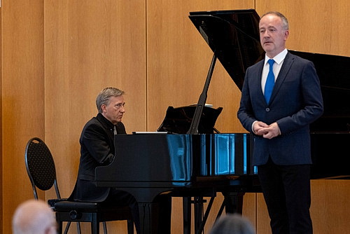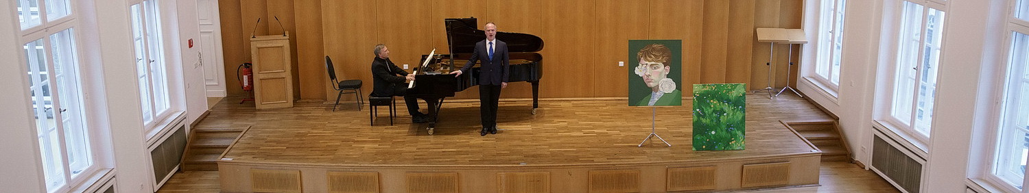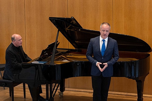 Trotzdem ist der Saal – auch dank der Studenten, die zahlreich erschienen sind – halbwegs gut gefüllt. Die guten Erfahrungen mit dem ersten Abend können die Herren nicht dazu verleiten, vom traditionierten Konzertformat abzuweichen. Keine Begrüßung, nicht mal ein paar Worte zu den Liedern, die Musik muss für sich selbst sprechen. Hans Eijsackers nimmt als erster am Flügel Platz und greift beherzt in die Tasten, um mit Konrad Jarnot Robert Schumanns Liederkreis Opus 24 zu durchschreiten. Der Bariton hat eine ausgesprochen erfolgreiche Sängerkarriere absolviert, war auf allen wichtigen Bühnen zu Gast, ehe er sich entschied, den Konzertbetrieb gegen die Lehre einzutauschen. Aus Sicht seiner Studenten die einzig richtige Entscheidung. Heute Abend kehrt er förmlich in sein früheres Leben zurück. Aufrecht die Haltung, abgezirkelt die Bewegungen, ganz fein zeichnet die Mimik die gesungenen Texte nach. Eijsackers scheint den großen Zugriff zu lieben. Was auf großen Bühnen unabdingbar ist, wird im Kammermusiksaal von Palais Wittgenstein leicht zum Problem. Da gerät Lautstärke schnell zum Dröhnen. Jarnot lässt sich davon nicht beirren und zeigt ein schier unbegrenztes Stimmvolumen, ohne wesentlich an Textverständnis zu verlieren. Das ist mehr als eindrucksvoll.