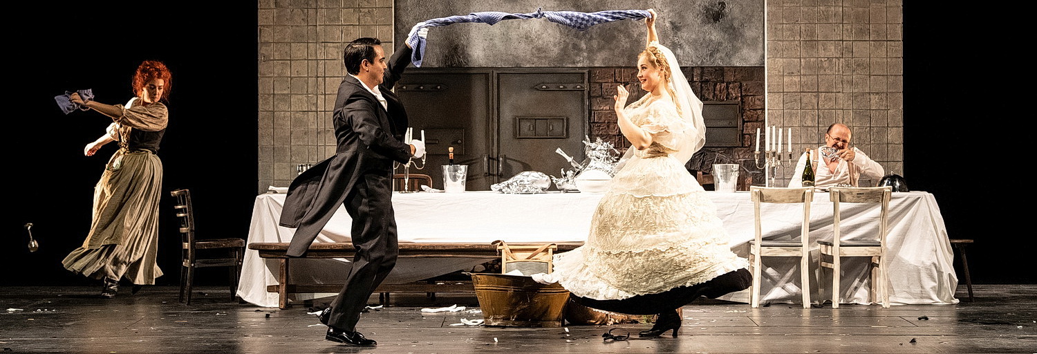 Die ironisch-melancholische Stimmung von Weinbergs 1985 in Moskau uraufgeführter Oper passt gar nicht so schlecht zur Situation der Kulturlandschaft, die massiv am Wiederaufschwung behindert, aber dennoch, mit gebotener Zuversicht, überleben wird. Dabei spricht Weinberg, der mit seiner Oper Die Passagierin, unter anderem auch in Gelsenkirchen, eine späte Anerkennung im Westen gefunden hat, pointiert den Ur-Traum der Menschen, und zwar aller Menschen, an: den Traum von einem glücklichen Leben. In dem der Oper zugrundeliegenden Theaterstück von Scholem Alejchem, dem wir auch den Stoff zum Musical Anatevka verdanken, sind es drei Dienstboten und ein vom Pech verfolgter Buchhändler, die im Untergeschoss der sozialen Hierarchie träumen, lieben, klagen, lachen und über die hochgestellte „Madame“ lästern. Die Madame lässt die Verlobungsfeier ihrer Tochter vom pausenlos schuftenden Personal vorbereiten. Sie thront unsichtbar über der Küche, dem zentralen Spielort, und lässt nur ab und zu Schimpftiraden über die Faulheit des Gesindes ertönen. In der Wortwahl proletenhafter als der einfachste Proletarier. Am Ende erscheint die Hausherrin doch noch, fällt allerdings dem Festmahl zum Opfer, das Personal tanzt auf den Tischen und feiert eine Doppelverlobung. „Wir gratulieren!“