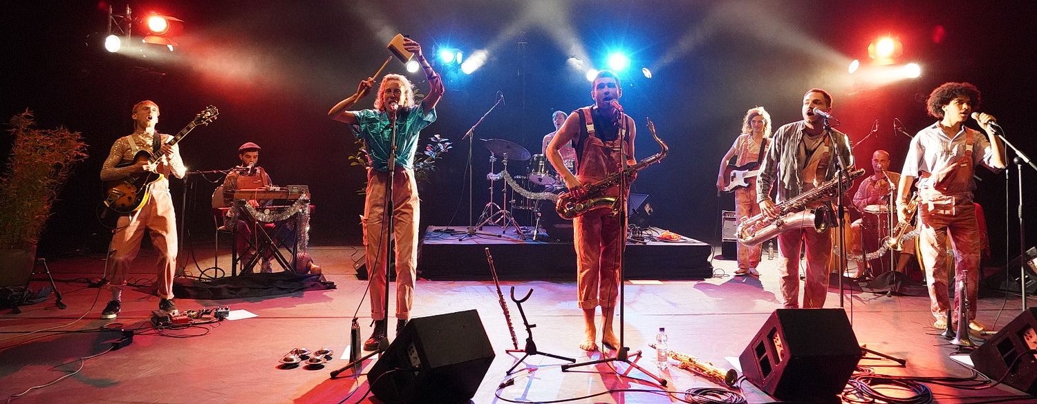 Wir wollen doch nur Spaß. So könnte das Motto des heutigen Abends lauten. Wenn die neun Musiker die Bühne in ihren lachs­far­benen Latzhosen zeitver­setzt betreten und zu ihren Instru­menten schreiten, spülen sie eine Welle der guten Laune ins Theaterzelt am Burgplatz. Vermutlich allesamt gute Freunde im Geiste von Miles Davis, der die Musik bekanntlich in zwei Kategorien teilte. Es gebe gute und schlechte Musik. Über das Muito Kaballa Power Ensemble wird geschrieben, man bekomme Afrobeat, Jazz, Funk und Latin zu hören. Tatsächlich wird in den kommenden zwei Stunden eine höchst eigen­ständige Mischung zu hören sein, die genau einen Zweck verfolgt: Gute Musik zu machen. Zur „guten“ Musik gehört eindeutig die tanzbare. Und weil das Publikum nicht tanzen darf, übernimmt die Band das gleich mit. Von der Impro­vi­sation über die einstu­dierte Choreo­grafie bis zur Brass Band in der ameri­ka­ni­schen Musik­parade ist alles dabei. Gleich mit dem ersten Titel zeigt das Ensemble, dass es auch Spaß am Wortwitz hat. Der Titel, den Nora Beisel anstimmt, heißt Don’t go. Die Refrain­zeile dann Don’t go too far. Von geh nicht zu geh nicht zu weit erinnert an den Kanari­en­vogel, der im Zimmer herum­fliegt, obwohl das Fenster geöffnet ist. Mit Inside Outside gibt es dann viel Bewegung auf der Bühne. Es folgen Chung und Aga Aga, ehe es eine richtige schöne Geschichte aus dem brasi­lia­ni­schen Regenwald gibt. Curupira ist eine Legen­den­ge­stalt, die dafür sorgt, dass sich Wilderer immer weiter im Dschungel verirren, um so die Natur zu schützen. Natürlich ist auch das Lied nach diesem Dämon benannt, mit dem die Band auf den Natur­schutz aufmerksam macht. Wie schön, dass hier die Belehrung ausbleibt und dem Klima­schutz damit an diesem Abend Genüge getan ist. Mit Little Child wird es dann für einen Moment ein wenig ruhiger, weil es doch um unsere Seele und den sorgsamen Umgang mit ihr geht. Money erinnert an Inside Outside und hält den Schwung der Aufführung aufrecht.