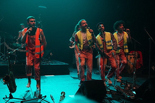 Mamari – so heißt im Arabi­schen der leicht schwan­kende Gang eines Kamels, der so manchem Reiter schon die Seekrankheit einge­bracht hat. So lautet auch der Titel des Albums, dass das in Köln, Leipzig und Berlin behei­matete Ensemble im Mai heraus­ge­bracht hat und dessen Programm es heute Abend im Wesent­lichen spielt. Andre van der Heide spielt den Grund­rhythmus am Schlagzeug, Leonard Gaab sekun­diert ihm an den handge­schla­genen Trommeln. Till Weise hält sich mit seinem Bass bevorzugt im Hinter­grund. Vorne stehen Lilian Thomas mit seiner Trompete, Tim von Malotki mit dem Bariton-Saxofon und „natürlich“ Niklas mit dem Tenor-Saxofon, an der Flöte und am Synthe­sizer. Auf der linken Seite bearbeiten Benjamin Schneider die E‑Gitarre und Jan Janzen die Keyboards. Nora Beisel greift ebenfalls zu verschie­denen Rhythmus-Instru­menten, wenn sie nicht gerade die außer­ge­wöhn­liche Bandbreite ihrer Stimme präsen­tiert. Das Publikum freut sich an der Musik, rutscht unruhig auf den Sitzen herum und nutzt jede Gelegenheit, die Musik klatschend zu begleiten. Nach Tin Tin gibt es mit Danser Danser, das für das franzö­sische Tanzen steht, eine gute Gelegenheit, unter viel Applaus die Bühne zu verlassen. So richtig mag damit keiner den Abend schließen. Und so kehrt Gaab auf die Bühne zurück, um einen afrika­ni­schen Kanon anzustimmen, zu dem sich die Band erneut zusammenfindet.