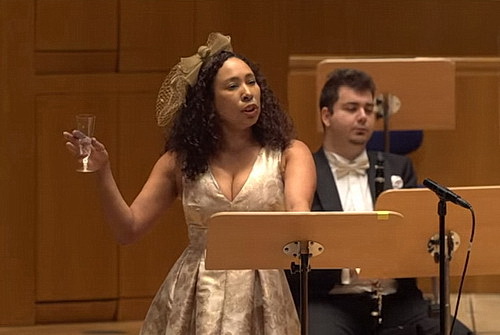 Ganz besonders deutlich wird das bei Benjamin Brittens Variations on a theme by Frank Bridge op. 10 oder der Romanze für Violine und Orchester in F‑Dur op. 50, bei der sich der Erste Konzertmeister der Düsseldorfer Symphoniker, Dragos Manza, ganz weit in den Vordergrund spielen darf. Was ist ein Neujahrskonzert ohne eine Besonderheit, die es so bei keinem anderen Konzert gibt? Gar nichts. Das geht vielleicht bei den Wiener Philharmonikern, wenn Oma und Opa und die Superreichen dem alljährlichen Ritual folgen. Aber bei allen anderen ist mehr Fantasie gefragt. Und Michael Becker ist hier mit dem Glück des Tüchtigen versehen. Denn Marisol Montalvo ist in der Stadt. Und die steht immer für das Außergewöhnliche. 1922 komponierte William Walton die instrumentale Begleitung zu einer Serie von Gedichten, die Edith Sitwell 1918 begonnen hatte und die in einer Sammlung mit dem Namen Façade – An Entertainment bekannt wurden. Sitwell verdrängte die Inhalte und hob Klang und Rhythmus der vorgetragenen Worte in den Vordergrund. Walton trug dem Rechnung. Und so stehen bei den an diesem Abend vorgetragenen Ausschnitten weniger die fantastischen stimmlichen Möglichkeiten von Montalvo im Vordergrund als vielmehr ihre Lust, sich mit dem Werk auseinanderzusetzen. Das gelingt auch ohne Publikum bravourös. Und das Nachspiel La Réjouissance aus der Feuerwerksmusik von Georg Friedrich Händel wirkt tatsächlich mehr wie ein Abgesang, obwohl es im Vortrag keine Abzüge gibt.