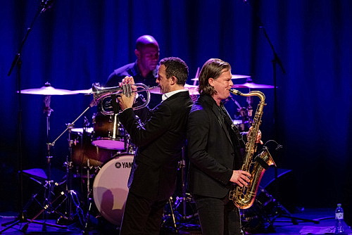 Mit dem Swing-Klassiker The Good Life von Sacha Distel aus dem Jahr 1969 geht es los. Ganz entspannt. Olaf Polziehn zeigt schon mal mit einem Solo, was er am Flügel zu bieten hat. Die drei Tage des Condor in der Regie von Sydney Pollack aus dem Jahr 1975 gehört immer noch zu seinen Lieblingsfilmen, verrät Brönner. Und das mag auch an der Titelmusik liegen, die von Dave Grusin stammt und jetzt grandios vorgetragen wird. Dabei treten Bassist Christian von Kaphengst und Tenorsaxofonist Mark Wyand mit einem Duo in den Vordergrund.
