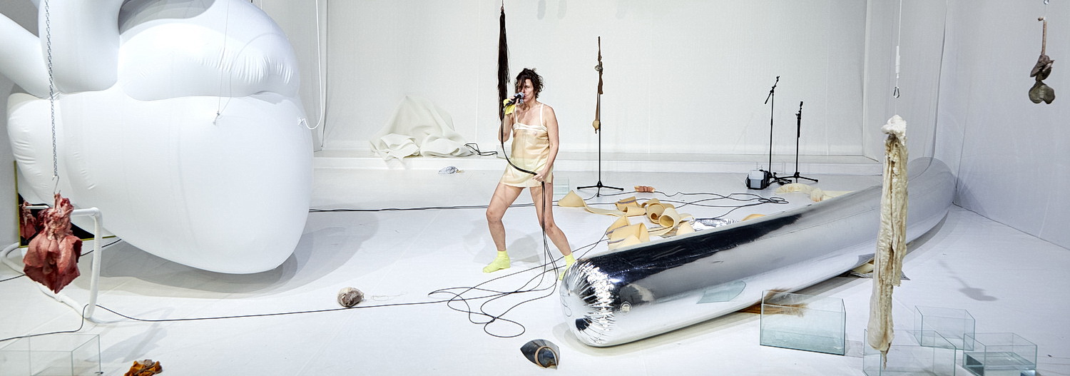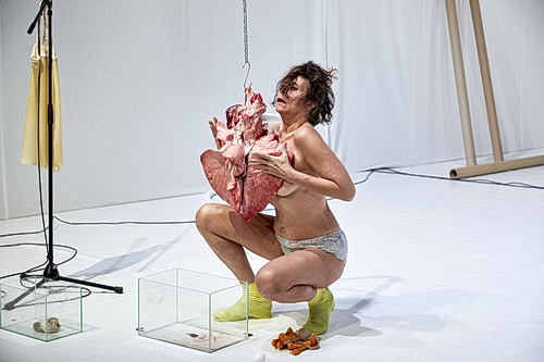 So auch im Forum Freies Theater in der Düsseldorfer Kasernenstraße. Hier läuft eine der letzten Vorstellungen vor dem nächsten Shutdown. Die Mitarbeiter des Hauses, denen aller Frust der Welt zusteht, lassen sich nichts anmerken, achten penibel auf die Einhaltung der Sicherheitsvorkehrungen und bleiben höflich bis freundlich. Sogar der Beginn gelingt pünktlich. Gerade mal drei Wochen liegt die Uraufführung in Wien zurück, jetzt stellt Claudia Bosse ihr erstes „Solo mit Komplizen“ unter dem Titel Oracle and Sacrifice 1 – oder die Evakuierung der Gegenwart in Düsseldorf vor. Orakel und Opfer, das klingt in Verbindung mit dem Bühnenbild erst mal spannend. Denn die Bühne ist ein weißer Raum, der kontinuierlich grellweiß ausgeleuchtet wird. Darin finden sich verschiedene Stationen, an denen verschiedene Organe auf ihre Einbindung in den Abend warten. Teils als Präparate, die Dagmar Tröstler besorgt hat, teils als künstlerisch abstrahierte Gegenstände, wie das Herz, das zu Beginn noch als großer, weißer Plastiksack an der Decke hängt. In eine Rinderlunge wird immer mal wieder Luft geblasen, so dass sie sich lebensecht ausdehnt. Die „sterile“ Atmosphäre sorgt dafür, dass hier selbst für den Laien nichts unheimlich oder gruselig wirkt.