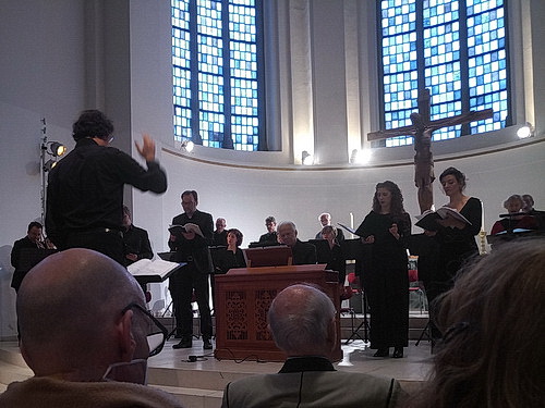 Es ist verständlich, dass nur zwölf der 26 Nummern aufgeführt werden. Alles andere hätte den aus Laiensängern bestehenden Kammerchor Düsseldorf bei weitem überfordert. Ausgesucht hat man sich SWV 23–27, 31, 33–36, 41 und 46. Die rund 25 Choristen legen sich hochmotiviert mächtig ins Zeug. Ausdrucksstark und verständlich singen sie die Texte. Dabei lotst sie Kantor Wolfgang Abendroth dank präzisen und aufmunternden Anweisungen zuverlässig durch den teils nicht leichten Notentext. Trotzdem sind ein paar Einsätze etwas unpräzise, manchmal ein wenig schüchtern und nicht ganz intonationsrein.