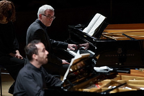 Sorgen sind an diesem Abend jedoch fehl am Platz, da neben dem bestens aufein­ander einge­spielten Klavierduo ebenfalls aus Hannover mit Klaus Reda und Andreas Boettger, wo sie auch beruflich aktiv sind, zwei Spitzen-Schlag­zeuger mit auf der Bühne sind. Vom ersten Moment an, mit dem Einsatz des ganz leisen Pauken­wirbels, stimmt alles auf den Punkt. Die Inter­aktion unter­ein­ander ist vorbildlich. Jede Phrasierung wird anschaulich heraus­ge­ar­beitet. Der Wechsel von rhyth­mi­scher Dominanz und lyrischen Episoden im ersten Satz wird muster­gültig darge­stellt. Atmosphä­risch-zart wie ein Raunen und Flüstern, erklingt der langsame Mittelsatz. Der finale Tanzsatz sprüht vor unbän­diger Ausge­las­senheit, bis er ganz leise, kontem­plativ ausklingt.