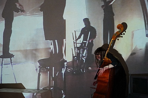 Wer nun auf spannende Bettgeschichten hofft, darf enttäuscht zusehen, wie das Geviert vom Podium um das Bett herum aufgestellt wird und so nur noch die Einblicke der Kamera übrigbleiben. Im Bett wälzt sich derweil Tänzer Damiaan Veens. In das Geschehen mischen sich immer wieder Kontrabassistin Anna Größbrink und Saxofonist Benjamin Jones. Ihre Interventionen geschehen meist leise bis kaum hörbar, mal solistisch, mal im Verbund mit den anderen Musikern. Wenn Lena Müller nicht kurze Textstellen aus dem Roman vorträgt – hier ist die Technik unzureichend und nimmt ihr die Verständlichkeit – reiht die Schauspielerin sich bei den Tänzern und ihren Barhockern ein.