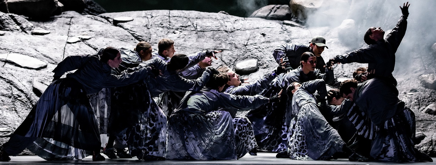 Gleichwohl: Das Düsseldorfer Premierenpublikum zeigt sich von allen drei Kreationen hellauf begeistert, auch vom Kernstück des Abends, Strawinskys Meilenstein in einer neuen Deutung des jungen spanischen Choreografen Marcos Morau. Und das, obwohl seine Arbeit mehr visuell als tänzerisch überzeugt. Optisch zieht ein gewaltiges, schräg ansteigendes Felsmassiv von Bühnenbildner Max Glaenzel die Blicke auf sich, das imponiert, aber die Bewegungsfreiheit der Tänzer stark einschränkt. Im Dämmerlicht von Marc Salicrú sieht man, wie 16 dunkel gekleidete Tänzer wie Nachfahren des Sisyphos versuchen, die Schräge emporzukriechen. Meist vergeblich und immer wieder zurückrollend. Um ein Menschenopfer zu Ehren der Frühlingsgötter geht es Morau nicht. Die Welt befindet sich bei ihm in einer Endzeitstimmung. Die Menschen quälen sich gegenseitig, um am Ende in einer Art gemeinschaftlichen Suizids, teils freiwillig, teils mit Nachhilfe, vom Fels in den Tod zu springen. Hoffnung auf die Lebenskräfte des Frühlings kann und soll in dieser düsteren Szenerie nicht aufkommen. Eine Arbeit, die durch ihre visuelle Wucht beeindruckt, auch wenn die vitale Musik Strawinskys etwas anderes als selbstzerstörerische Resignation ausdrückt. Und tänzerisch fällt Morau nicht allzu viel ein. Man bewegt sich zuckend zu den rhythmischen Eruptionen der Musik, kriecht oft auf allen Vieren, geht sich bisweilen gegenseitig an die Gurgel und hüpft am Ende vom Plateau.