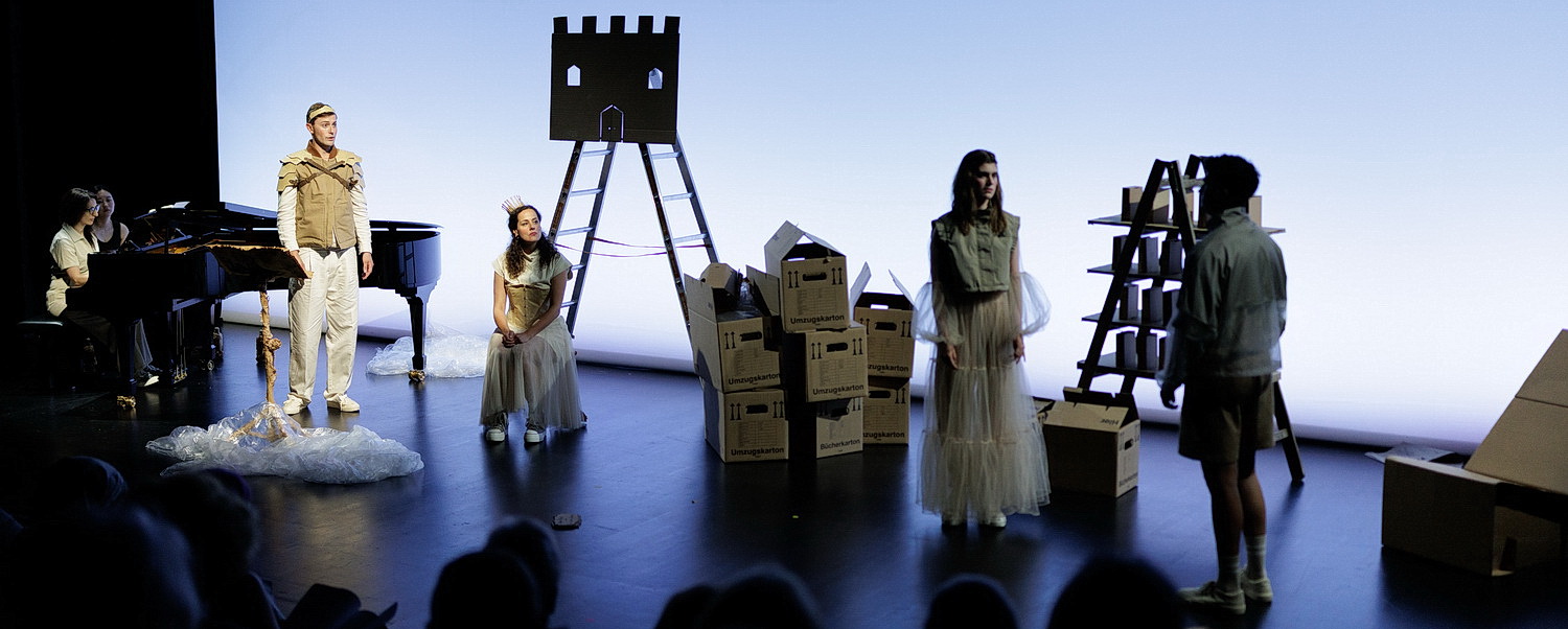 Ähnlich fantasievoll hat Justine Loddenkemper die Kostüme entworfen. Leichte bequeme Kleidung, die mit Tüll und Accessoires wie selbstgebastelten Krönchen, Schleier und Brustpanzern angereichert werden. Dass es dazu Turnschuhe gibt, mag dem Zeitgeist geschuldet sein. Allerdings ist im Konzept von Zeigermann für die nunmehr fünf Personen auf der Bühne, nämlich zwei Sänger, zwei Darsteller und die Pianistin, die Notwendigkeit, sich zu bewegen, nicht eben überbordend. Wird gesungen, verschwinden die Darsteller im Halbdunkel und umgekehrt. Hin und wieder gibt es Schattenspiele oder eben den Zusammenbau des Regals, bei dem sich die Frau dem Mann hoch überlegen zeigt. So hat Zeigermann immer wieder auch mal etwas zum Schmunzeln eingebaut, selbst die mindestens viermalige Erwähnung, wie „krass“ etwas ist, kann man hier als running gag verstehen.