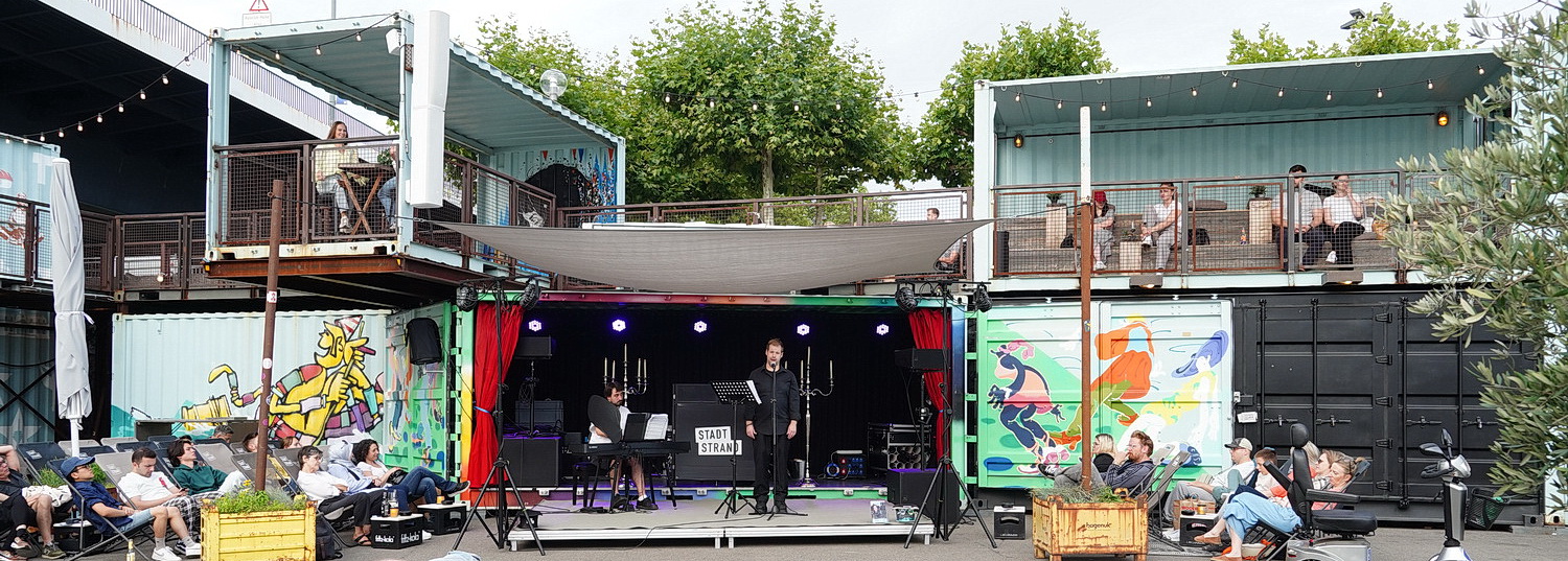 Wir wollen, dass Kultur für die Menschen kostenlos ist“, sagt der Mann, der sich nicht vorstellt, aber anscheinend für die Organisation vor Ort zuständig ist. Deshalb gibt es den Stadtstrand am Tonhallenufer. Als Gegenleistung erwarte er allerdings, dass die Gäste sich Getränke kaufen und für den Auftritt der Künstler eine „Spende“ entrichten. Eine merkwürdige Art der Augenwischerei, aber sie scheint zu funktionieren. Die Liegestühle, die vor den Containern mit der Bühne am Tonhallenufer in Düsseldorf aufgestellt sind, sind gut besucht. Für einen Donnerstagabend mit bedecktem Himmel bei 22 Grad sogar sehr gut besucht. Thomas Huy, Kurator der Reihe Classic on the Beach und Moderator des heutigen Abends, lädt zu Klassik meets Filmmusik – von Barock zu Neoklassik, einem Gesangs- und Klavierkonzert, ein. Und dass er die Moderation auf ein Minimum beschränken will, sagt er auch gleich.
