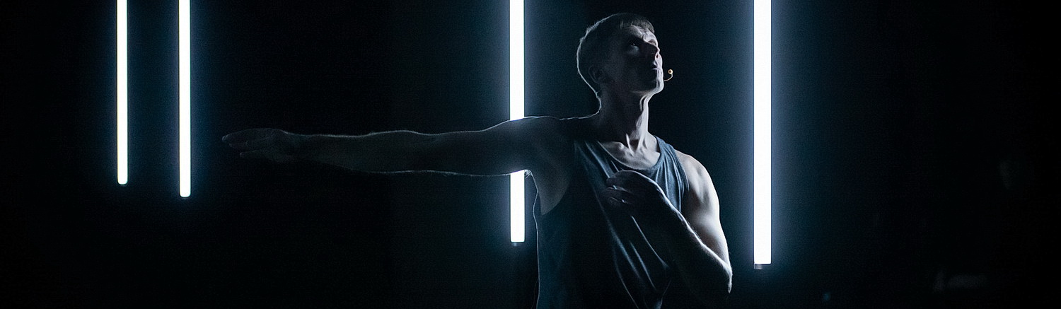 Stages into the Now, was man etwa mit Bühnen in die Gegenwart übersetzen könnte, heißt das neue einstündige Werk, das am 4. und 5. März im Düssel­dorfer Tanzhaus NRW erstmals zur Aufführung kommt. Unter Einsatz von Wort, Tanz, Licht und Musik tanzt Scott Jennings gegen das Verlangen an, sich bewegen zu müssen. Waier­stall hat den großen Saal im Tanzhaus auf den eigent­lichen Bühnenraum verkleinert. Hier stehen jetzt über drei Seiten Tribünen. Vor ihnen und damit vor der Rückwand der Bühne ist eine Leinwand aufgebaut, unter der eine ganze Batterie von Schein­werfern nach oben leuchtet. Das gehört mit zum fabel­haften Licht­konzept von Caty Olive. Licht­kästen beleuchten die Bühnen­mitte. Im Raum aufge­hängt sind Licht­stangen, die anfangs leblos hängen, später aber in dauer­hafte Schwin­gungen versetzt werden können. Oberhalb der Seiten­bühnen, die jetzt mit schwarzem Stoff verhängt sind, der nur oben etwa ein Fünftel Platz lässt, ist das Putzlicht zu erkennen. Hinter den Zuschauern, auf der großen, eigent­lichen Tribüne ist noch mal eine Serie von Schein­werfern aufgebaut. Mit diesen Mitteln weiß Olive für die richtige Stimmung zu sorgen und die Drama­turgie zu unter­stützen. Lange schon hat man keine derart filigran und schön ausge­leuchtete Bühne gesehen.