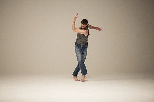 Auf dieser Grundlage hat Waier­stall sich etwas Beson­deres einfallen zu lassen. Anstatt Scott Jennings sich nun in immer neuen Schritten veraus­gaben zu lassen, übersetzt die Choreo­grafin das Prinzip der Minimal Music auf alle Elemente ihres Werks. In der wunderbar spröden Klavier­musik von Volker Bertelmann aka Hauschka ohnehin schon angelegt, werden Wort‑, Tanz‑, Musik‑, Film- und Licht­ele­mente permanent in kaum merklichen Varia­tionen wiederholt. Darunter ist eine Entwicklung angelegt, die für eine Expansion in allen Bereichen sorgt. Jennings erweitert nach und nach seine Kreise, bis er schließlich … aber das sollte man sich selbst ansehen. Aus der Reduktion, in die Waier­stall immer wieder kleine Überra­schungen einbaut, hält sie die Spannung aufrecht. Dass Jennings dabei wiederholt vollkommen unauf­dringlich Kontakt zum Publikum aufzu­nehmen versucht, verleitet zu Fragen, die sich der Besucher selbst stellt.