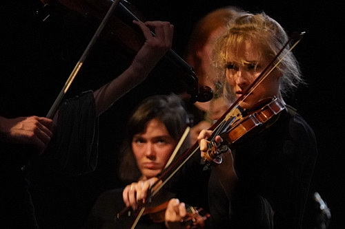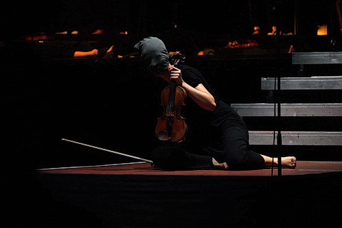 26 Musiker betreten die Bühne, auf der lediglich ein paar Mikrofone, Stühle und zwei Schlagwerke aufgebaut sind. Die Gesichter der Instrumentalisten sind mit Wollmasken vermummt. Die Masken werden zum running gag während der nächsten anderthalb Stunden. Das Orchester, zu dessen Grundprinzipien gehört, sich während der Aufführung auf der Bühne, im Saal und auf den Rängen zu bewegen, muss sich heute auf Bühne und Vorbühne beschränken. Spannender als die Gänge zur Vorbühne oder die Freistellung der Solisten sind allerdings noch die tableaux vivants, in der nur noch wenige Instrumente zu hören sind, während die untätigen Musiker „einfrieren“. Da entstehen eindrucksvolle, fast schon museale Bilder. Hinzu kommen „Kostümwechsel“, wenn die jungen Leute beispielsweise ihre schwarzen Oberteile ablegen und darunter rote und graue T‑Shirts zum Vorschein kommen.