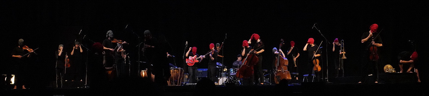 26 Musiker betreten die Bühne, auf der lediglich ein paar Mikrofone, Stühle und zwei Schlagwerke aufgebaut sind. Die Gesichter der Instrumentalisten sind mit Wollmasken vermummt. Die Masken werden zum running gag während der nächsten anderthalb Stunden. Das Orchester, zu dessen Grundprinzipien gehört, sich während der Aufführung auf der Bühne, im Saal und auf den Rängen zu bewegen, muss sich heute auf Bühne und Vorbühne beschränken. Spannender als die Gänge zur Vorbühne oder die Freistellung der Solisten sind allerdings noch die tableaux vivants, in der nur noch wenige Instrumente zu hören sind, während die untätigen Musiker „einfrieren“. Da entstehen eindrucksvolle, fast schon museale Bilder. Hinzu kommen „Kostümwechsel“, wenn die jungen Leute beispielsweise ihre schwarzen Oberteile ablegen und darunter rote und graue T‑Shirts zum Vorschein kommen.