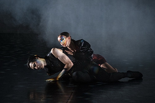Der heutige Abend beginnt, wie üblich mit etlicher Verspätung, mit einer Choreo­grafie von Dukin Sco. Die Bühne ist leer bis auf ein „magisches Auge“ vor einer weißen Leinwand im Hinter­grund. Überschrieben ist die Choreo­grafie mit Eternal Realm, also Ewiges Reich. Sara Giova­nelli und Miquel Martìnez Pedro durch­tanzen eine Schat­tenwelt, in der die eigene Existenz fraglich scheint. Versöhnlich schreitet das Paar schluss­endlich in eine ungewisse, aber glück­ver­spre­chende Zukunft. Tänze­risch werden die beiden sicher nicht überfordert. Das gilt auch für die nachfol­gende Aufführung, die von der Compagnie Artmann & Duvoisin aus Köln gestaltet wird, wenngleich es hier gegen Ende deutlich artis­ti­scher wird. Camilla Agraso, Lotte James und Andrea Tozza aus dem Opern­ballett zeigen gemeinsam mit Elsa Artmann und Samuel Duvoisin in Love Deluxe (How We Do It) Verspre­chungen. Kurze Tanzbe­we­gungen werden englisch kommen­tiert, während Musik von Annie Bloch einge­spielt wird. Wenn Artmann und Duvoisin in ihren sonstigen Arbeiten viel Wert auf die Integration des Publikums legen, scheinen sie sich jetzt eher dem Corps­geist des Projekts verpflichtet. Und so bleibt die Blase geschlossen, das Publikum Kulisse und Beweih­räu­che­rungs­in­strument. Im Laufe des Abends wird das noch deutlicher werden.