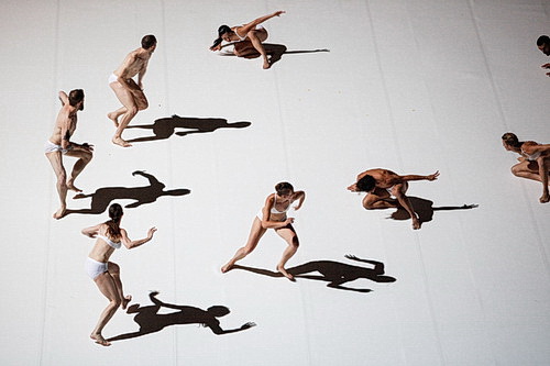 Die weiße Fläche der Bühne ist leer. Am linken Rand sind kleine Textilhaufen nebeneinander aufgeschichtet. Fünf Tänzerinnen und fünf Tänzer betreten die Bühne in Trainingskluft, teilen sich in zwei gemischte Gruppen auf und beginnen, so scheint es, ihr Aufwärmtraining. Ständig werden Abläufe, Figuren und Konstellationen wiederholt, während die repetitiven Elemente des Stückes Dérive 2 von Pierre Boulez das Geschehen unterstreichen. Nach etwa 20 Minuten wird das Aufwärmen beendet, die Tänzer schreiten zum Bühnenrand und legen ihre Sportkleidung ab. Nacheinander betreten die Gruppen in weißer „Unterwäsche“ die Fläche wieder, um erneut zu zeigen, was sie in der Vorübung einstudiert haben. Und spätestens jetzt zeigen sich die Vorteile des Aufführungsortes. Ohne jegliche Außeneinflüsse, ohne ablenkende Aktivitäten eines Orchesters am Bühnenrand gewinnt die Choreografie an Konzentration und Intimität.