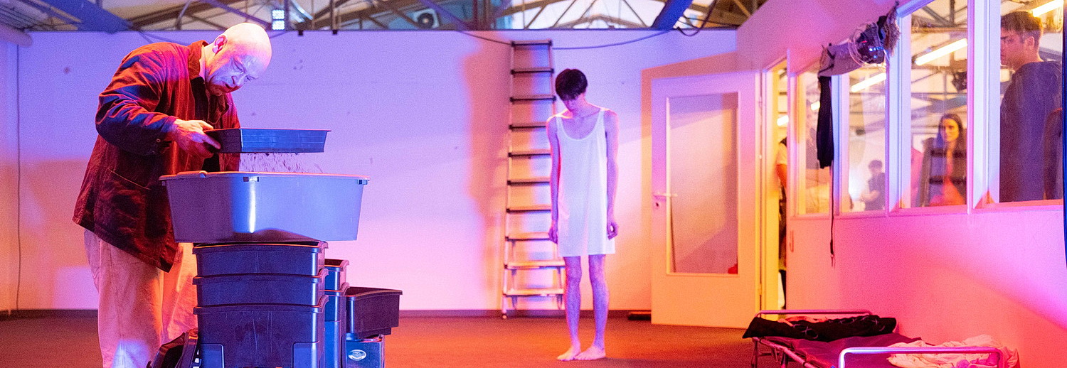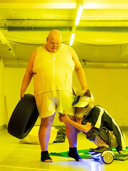 Nach dem eindrucks­vollen Auftakt­mo­nolog öffnen sich die Rolläden zur nächsten Halle, dem eigent­lichen Veran­stal­tungsort. Da huschen verschiedene Menschen durch eine Endzeit, die sie wie durch ein Wunder überlebt haben. Ein paar Barken, ein altes Auto. Nile Koetting, Heinrich Morawitz, Liina Magnea und Neave Arijn Helve sind in die im doppelten Wortsinn fantas­ti­schen Kostüme von Nicola Gördes und Johanna Senger gekleidet. Da gibt es das Kaninchen und andere Überle­bende der Endzeit-Katastrophe. Im Gegensatz zu ameri­ka­ni­schen Filmen sind hier nicht alle hübsch und glatt­ge­bürstet. Da gibt es den fetten Menschen, die Menschen, die auf ihren elektri­schen Hilfs­ge­räten auftauchen, warum auch immer es in der Endzeit elektrische Geräte gibt, und den psychisch Gestörten. Etwas, das in unsere Vorstel­lungswelt gar nicht hinein­passt. Wenn schon der komplette Untergang, dürfen wir doch wenigstens erwarten, dass die Schönsten der Welt überleben. Falsch gedacht. Dass der folgende Dialog in Englisch geführt wird, ist vollkommen absurd. Da wird die Diskussion um die Entwicklung der Männerwelt erklärt, die letztlich zum Exodus führt, ehe sich das Geschehen in Wortlo­sigkeit verliert. Mühsame, oft wertlose Annähe­rungen, mit Gespucke und abweh­renden Bewegungen garniert, führen das Geschehen fort. Derweil erklingen im Hinter­grund sanfte sphärische Klänge. Nach der ersten zerstö­re­ri­schen Begehung eines alten Autos erfolgt die zweite Dekon­struktion weiterer Automo­bil­teile. Spätestens an dieser Stelle regt sich der Wider­stand des alten, weißen Mannes, der neuer­dings so gern und oft zitiert wird. Wenn jemand kein Auto haben will, kauft er sich keins. So einfach ist das. Dass sich anschließend die Spiel­stätten aufsplitten und das mitwan­dernde Publikum jede Orien­tierung verliert, trägt weder zum Gefallen des Publikums noch zur Ausein­an­der­setzung mit dem Thema bei.