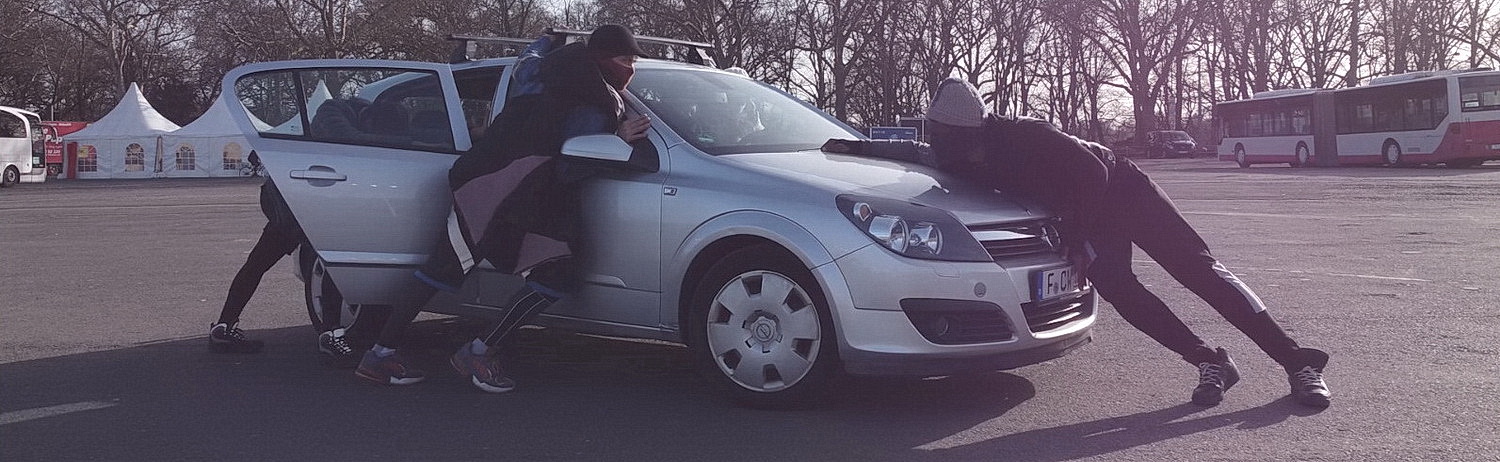 Beim in der Reihenfolge zuerst vorgeschlagenen Video handelt es sich um Car Walk mit einer Länge von rund 43 Minuten. Auf dem Parkplatz der Eissporthalle in Frankfurt am Main steht eine Limousine, die am hellichten Tag von vier Schweinwerfertürmen eingesäumt ist. Aufgenommen wird das Ganze sehr modern mit einer Drohne. Für Kamera und Schnitt aller Videos ist Florian Krauß zuständig, der hier einen sehr ordentlichen Einstand gibt. Ob die Panorama-Flüge in dieser Weitschweifigkeit notwendig sind, mag dahingestellt sein, aber wer eine Drohne besitzt, die erforderlichen Erlaubnisse und Genehmigungen mühsam eingeholt hat, möchte sie auch nutzen. Eindrucksvoller ist der Einsatz „vor Ort“, wenn die Szene abgefilmt wird. Das ist wirklich ausgezeichnet gelungen. Vier Tänzer und ein Fahrer nähern sich dem Fahrzeug. Sie tragen Trainingsanzüge, Gesichtsmasken und Mützen, der Fahrer hat eine Sturmhaube über den Kopf gezogen. Spitzentanz im Tütü hätte hier ohnehin niemand erwartet, aber die überzogene Neutralität – Sandra Li Maennel stand bei allen Kostümen beratend zur Seite – ist mindestens genauso irritierend. Und wer jetzt eine tänzerische Eroberung des silbergrauen Wagens erwartet, wird genauso enttäuscht. Während der Fahrer die Richtung vorgibt, schieben die Tänzer den Wagen vor und zurück, zeigen ansatzweise ein paar akrobatische Leistungen, die sich allesamt in Grenzen halten. Ja, das ist choreografiert, ein Kraftakt für jeden einzelnen sowieso, aber tänzerisch bleibt das eine gewollte Nullnummer. Diese Idee trägt nur begrenzt, und so ist die Freude groß, als die Zeit abgelaufen ist.
