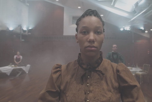 Zurück im „Festivalraum“ wird als nächstes Stück ein kompletter Szenenwechsel vorgeschlagen. In angekündigten 35 Minuten soll Picknick gezeigt werden. In einem großen Raum sind drei Buffets aufgebaut, auf denen sich ein paar typische Picknick-Lebensmittel, Geschirr und Gläser finden. Umgeben sind sie von Sitzgelegenheiten von barocken Sesseln bis zum aktuellen Liegestuhl. Magdalena Dzeco sitzt im hochgeschlossenen, braunen Kleid auf einem Buffet, auf dem anderen haben Sakurako Awano und Challenge Gumbodete teilgenommen, Tänzer und Tänzerin im eher ländlichen Gewand längst vergangener Zeiten. Im Nebel, der sich im Raum ausbreitet, lassen sie die Korken knallen, stoßen freudlos mit dem Schaumwein an und schieben sich ein Stück Käse in den Mund. Im Gegensatz zum Sekt schäumt in der Laune nichts über. Das gilt auch für das „Tanzvergnügen“, das sich auf Atem- und Bewegungsübungen beschränkt. Auch als sich Camilla Fiumara hinzugesellt, ebenfalls im Dirndl, beschwingt das die Situation nicht. Kurzfristig sind alle vier Tänzer auf der Fläche, dann muss Fiumara in einen Kübel kotzen. Alles sehr professionell von der Kamera eingefangen. Stimmlose Schreiübungen zeigen den unausgesprochenen Schmerz der Tanzenden, ehe sie sich im zunehmenden Nebel wieder an die Tische zurückziehen. Den Pokal für das traurigste Picknick der Saison dürften sich Billinger und Schulz damit schon mal verdient haben.