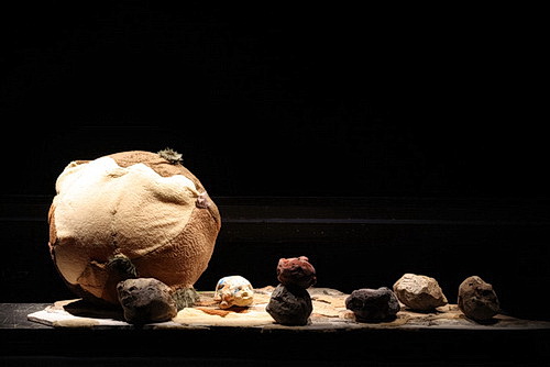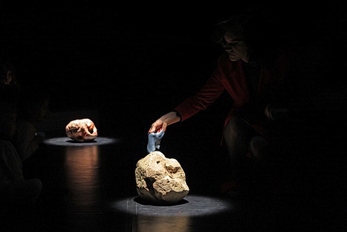 Das freilich bekümmert die Grundschüler nicht, die hierhergeführt wurden, um die Aufführung von Zinola zu erleben. Bevor sie etwas sehen dürfen, werden sie im Foyer einer „körperlichen Einführung“ unterzogen. Eine junge Frau leitet sie zu Wahrnehmungs- und Ertüchtigungsübungen an. Nach einer Viertelstunde ist es so weit. Die Schüler müssen ihre Schuhe ausziehen und sich vor der Tür zum großen Saal aufstellen. Dort werden sie von Alfredo Zinola und Salome D’Attillia begrüßt. Zinola im goldfarbenen Hemd und grauer Hose, dazu trägt er silberfarbene Strümpfe. D’Attillia tritt in einem roten Kostüm mit roten Strumpfhosen auf. Die Füße stecken in roten Pantoletten, deren Stege mit roten Federn bedeckt sind. Die Theaterwelt heißt ihre Gäste willkommen. Im großen Saal ist die Tribüne mit schwarzem Tuch verhängt. Die Bühne wird von rechts nach links, statt von vorne nach hinten bespielt. Yoav Admoni hat sie eingerichtet. Ihre Geheimnisse werden sich erst nach und nach entschlüsseln. Die Schüler werden auf der rechten Seitenbühne vor ein rotes Absperrseil geführt. Der Blick fällt auf die freie Fläche, an der seitlich Kissen ausgelegt sind. Am Kopfende ist eine Art Felsenlandschaft aufgebaut. Oh, da hat sich ein Stein wie von Geisterhand allein bewegt. Das Raunen ist unüberhörbar. Zinola und D’Attillia fordern die Kinder auf, in kleinen Gruppen nach der gereichten Kordel zu greifen, um sich zu den Sitzkissen geleiten zu lassen. Sehr aufmerksam, dass es für die älteren Herrschaften zwei Truhen gibt, auf die sie sich setzen dürfen. Ab einem gewissen Alter muss man einfach nicht mehr auf dem Fußboden sitzen.