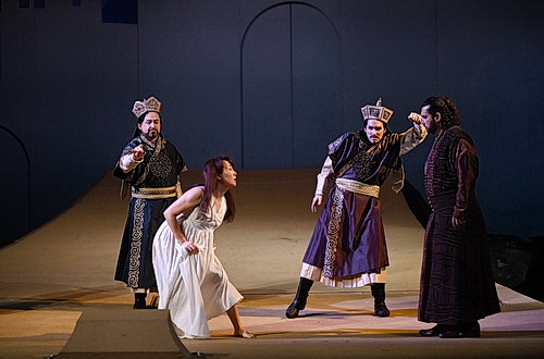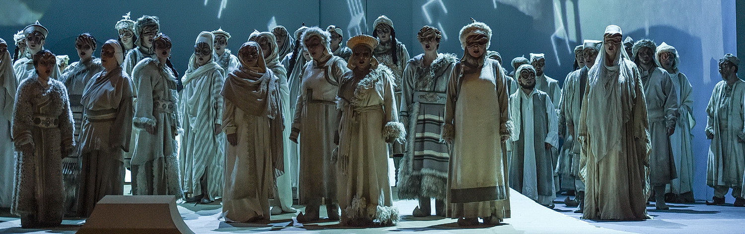 Für Sami Luttinen ist die Rolle des Timur, Kalafs Vater, auf den Leib geschrieben, der in ein großartiges Pilgergewand gekleidet ist und seinen Bass gebührend erklingen lässt. Altoum, Kaiser von China, kann man sich Tenor nicht so recht vorstellen. Ist das nicht wenigstens ein Bariton? Nun, Puccini hat entschieden, und Johannes Preißinger macht das Beste daraus. Die Minister Ping, Pong und Pang, gern häufig als etwas verhuscht dargestellt, geraten mit Jorge Espino, Nathan Haller und Florian Simson tatsächlich fast schon staatsmännisch, was letztlich gerade noch die Kostüme verhindern können. Und durch alle Reihen geistert, huscht und wuselt Yasha Wang als besagte junge Frau. Chor und Extrachor der Rheinoper, verstärkt von der Akademie für Chor und Musiktheater, sind von Gerhard Michalski in bewährter Form bestens einstudiert und spielfreudig.