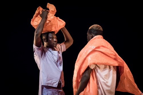 Djedonang Aimé, Jamal Noudjingar Theodore, Mintay Charly, Dakanga Hervé und Mahmat Saleh Koumbo erzählen tänzerisch Geschichten, die Ahmed Menschen abgelauscht hat, die im Rahmen der Aufführung auch namentlich genannt werden. In fünf verschiedene Kostüme gekleidet, die die unterschiedlichen Kulturen Afrikas andeuten, zeigen die Tänzer eine Mischung aus HipHop, Coupé-Décalé und zeitgenössischem Tanz, indem sie die Planen in ihre Figuren und Bewegungen einbeziehen. Vor der Klangkulisse von Benno Heisel werden die schon im Vorfeld Gestrauchelten gezeigt, diejenigen, die versuchen, ihr Schicksal allein zu meistern, wie auch die, die sich in Solidarität üben. Wertungen lässt Ahmed offen. Was aber alle eint, ist dieses eine Volkslied Oh No Eh, das die alten Zeiten heraufbeschwört. Hier dürfen sich zu einfachen, eingängigen Klängen der Vergangenheit auch noch mal alle Tänzer in Soli präsentieren. Und die Fäuste in die Luft recken. In Afrika, so viel ist klar, würde das Publikum spätestens hier einsteigen, mitsingen und mittanzen. In Düsseldorf gibt es ein weniger aufregendes Nachspiel. Hier wird die unerschütterliche Lebensfreude eingedampft auf einen Optimismus, dass es auch ein Morgen gibt. Immerhin.