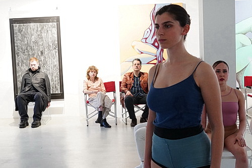 Zum Abschluss der Ausstellung aller­dings hat der BBK es sich nicht nehmen lassen, die zeitge­nös­sische Ballett-Kompanie Pascal Touzeau & Co. einzu­laden, die derzeit die vermutlich aktivste Tanztruppe in der so genannten Freien Szene der Stadt Düsseldorf ist. Gerade mal zwei Tage ist es her, dass die Tänze­rinnen mit einer Wieder­auf­nahme von Light­tra­veler am Worringer Platz an neuer Spiel­stätte zu erleben waren. Für die Einladung ins BBK-Kunst­forum wartet Choreograf Touzeau mit einer Urauf­führung auf. Im Grunde ist es eher eine work-in-progress-Aufführung, die auf die Urauf­führung der Langversion unter dem gleichen Titel Wings im Juni – dann vermutlich wieder im ES 365 – hinweist. Aber schon die gezeigten 15 Minuten an diesem Abend sind so intensiv, dass man getrost von einer eigen­stän­digen Arbeit sprechen darf.