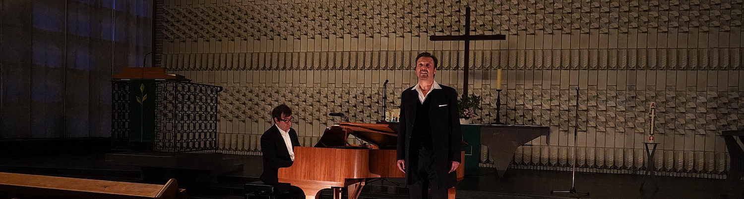 An diesem Sonntagnachmittag, es ist Allerheiligen, tritt so etwas wie eine kurzfristige Entspannung ein. Oder Erschöpfung? Egal. Sekundenlang hatte es die Überlegung gegeben, die hier geplante Aufführung zugunsten „wichtigerer“ Veranstaltungen wie etwas das schnell angesetzte Benefizkonzert der Kölner Philharmonie für die Kölner Freie Szene abzublasen. Aber dieses Konzert war seit Wochen geplant, wird von Einzelkünstlern durchgeführt, die jetzt wieder ein Auftrittsverbot auferlegt bekommen haben, und sich die Agenda noch weiter von der Regierung diktieren zu lassen, verursacht nur weiteres Unbehagen. Also bleibt es dabei, in den Stadtteil zu fahren, der lange vom nahegelegenen Waschmittelkonzern profitierte, inzwischen aber mehr einen Dornröschen-Schlaf begonnen zu haben scheint. Adolf Clarenbach war einer der ersten evangelischen Märtyrer am Niederrhein. Er wurde aufgrund seines Wirkens im 16. Jahrhundert in Köln auf dem Scheiterhaufen verbrannt. Nach ihm wurde die Klarenbachkirche in Holthausen benannt. Nach nur einjähriger Bauzeit wurde sie am 2. Oktober 1955 eingeweiht. Bis heute ist der separate Glockenturm ein Blickfang am Kamper Acker an der Bonner Straße. Die Kirche selbst wirkt ein wenig heruntergekommen, und so ist ihr Schicksal nach der Eingemeindung der Evangelischen Klarenbach-Kirchengemeinde in die Kirchengemeinde Düsseldorf-Süd absehbar. Vorerst aber kann man den „abgewohnten“ Charme der Kirche noch genießen. Und ganz offenbar mögen die Gemeindemitglieder ihre kleine Kirche. Denn die ist an diesem Nachmittag ausverkauft. Kantor Markus Maczewski hat Rolf A. Scheider und Thomas Hinz eingeladen, die Winterreise aufzuführen.